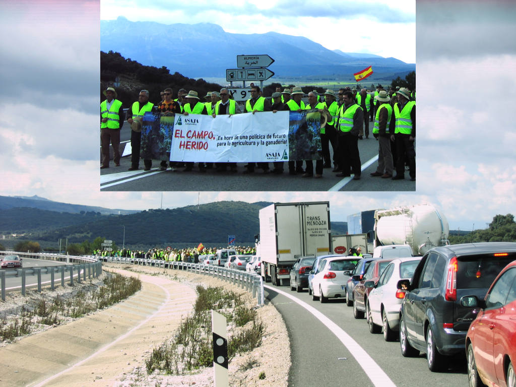 Medio millar de agricultores y ganaderos convocados por ASAJA GRANADA han realizado una ruidosa protesta y han cortado la carretera en el kilómetro 97 de la A-44 (el doble sentido), a la altura de la Venta la Nava, para reivindicar, al unísono con el resto de las provincias andaluzas sumadas al llamamiento de Asaja-Andalucía, las medidas necesarias para sacar a flote el sector que han sido relegadas al fondo del cajón por los gobiernos de Zapatero y de Griñán. Dos años de negociaciones de la organización agraria con las autoridades políticas central y autonómica no han conseguido por su parte una respuesta efectiva para paliar la grave situación y el campo vuelve a gritar en voz alta su descontento.
