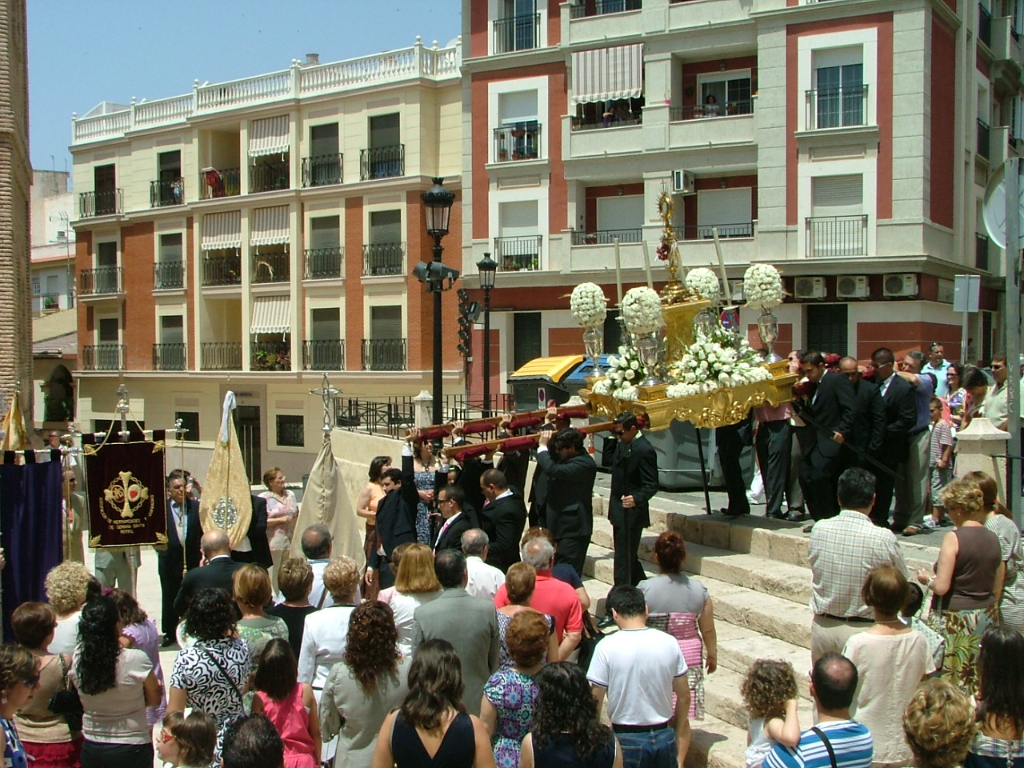 La conmemoración del día de Jesús Sacramentado se iniciaba a las 11 hrs de la mañana con una solemne eucaristía en la iglesia de la Encarnación que fue concelebrada por los párrocos de Motril y representantes de la comunidad agustiniana. A esa hora el templo parroquial se encontraba repleto de fieles, entre ellos casi un centenar de niños y niñas que en jornadas anteriores habían recibido por primera vez la sagrada comunión. Terminada la santa misa y tras un breve receso se iniciaba la tradicional procesión del corpus, que fue anunciada a todo Motril con una sonora traca de cohetes. A las 12,20 hrs la sagrada custodia hacía acto de presencia por la puerta lateral de la iglesia para dar pie a la organización de la comitiva procesional. El séquito religioso aparecía abierto con la cruz parroquial, a la que seguía una representación oficial de las cofradías y hermandades de la ciudad con sus tradicionales “bacalas”, guiones y estandartes. De seguida marchaban los niños y niñas revestidos con sus trajes de comunión, que desfilaban entonando canciones religiosas bajo la animada dirección de Diego Martín. A continuación miembros de la parroquia portaban el incensario, tras el que se situaban las andas en las que se porta la Sagrada Custodia, una autentica obra de arte en plata sobredorada del siglo XVII. Tras las andas se disponía la representación eclesiástica que había concelebrado la eucaristía, el palio de honor, una representación municipal y multitud de fieles que escoltaban la sagrada forma. Finalmente cerraba la marcha la banda de música municipal.