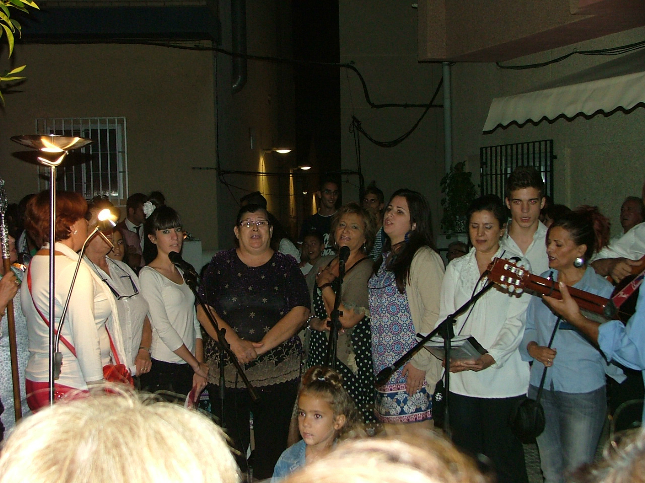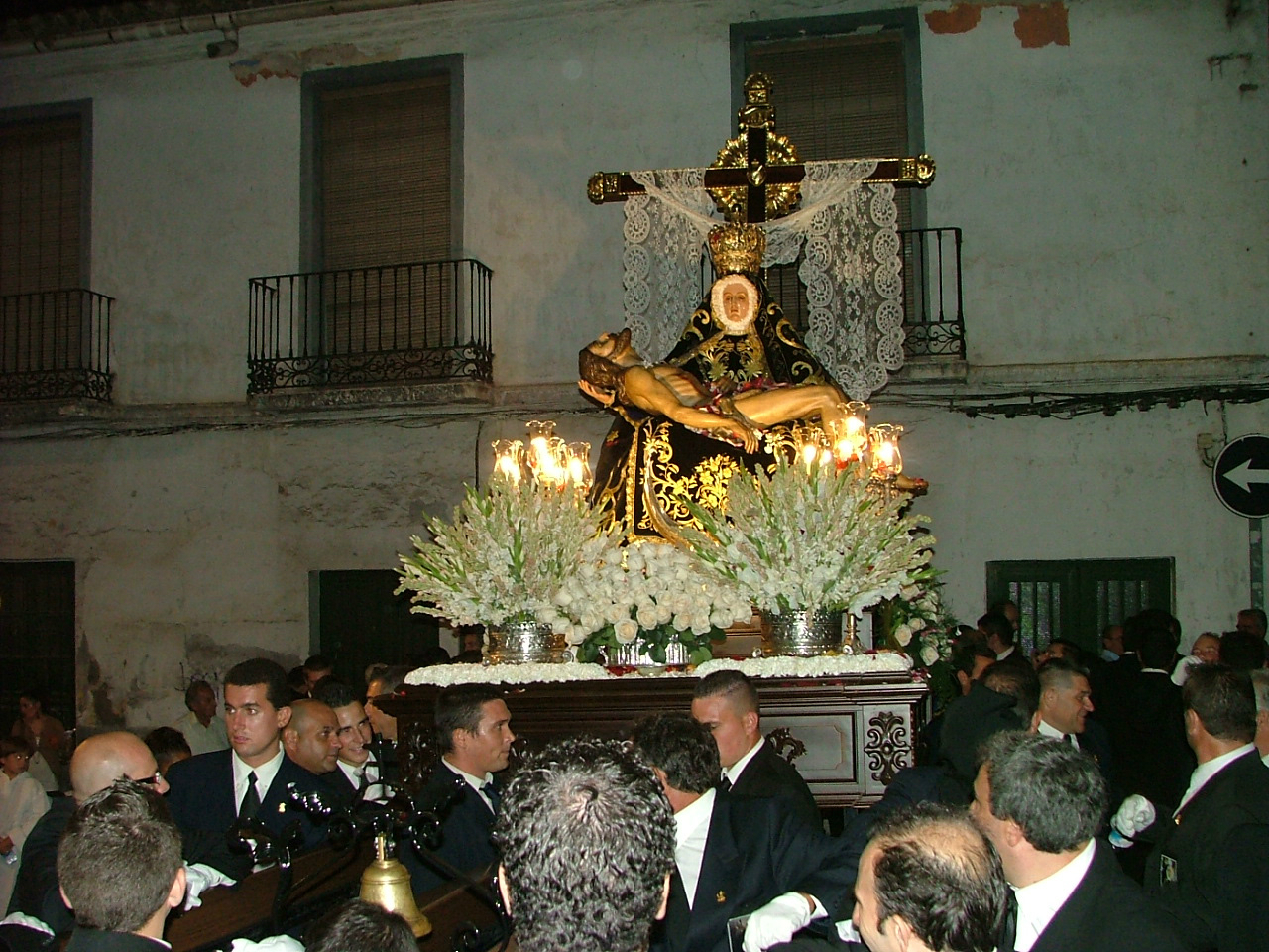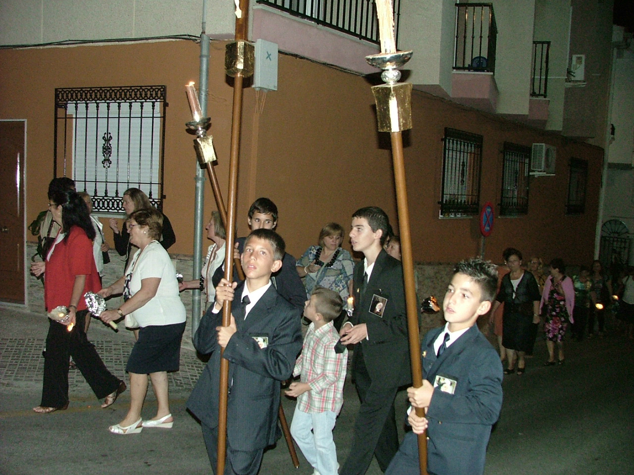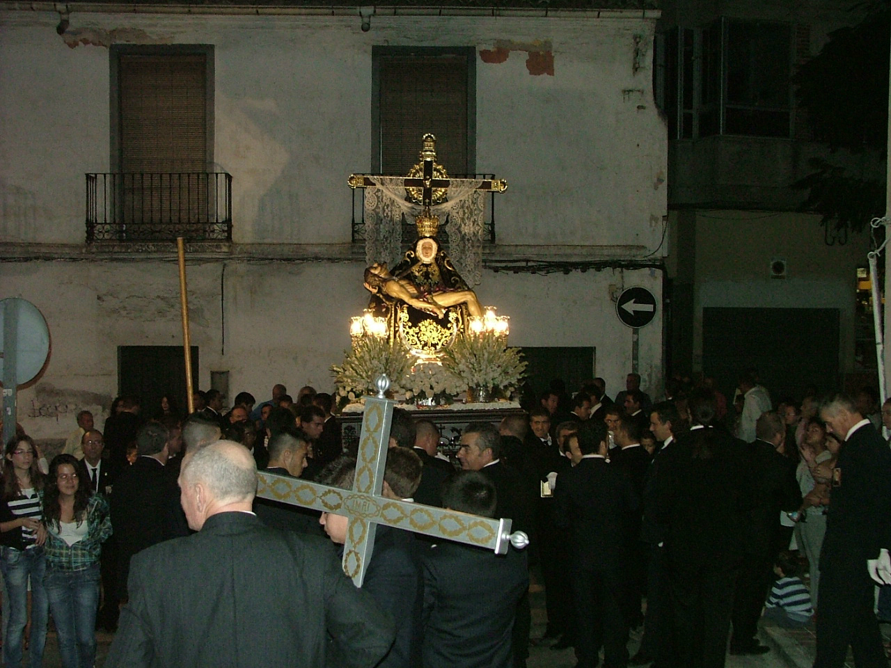 Fieles a la tradición, las Angustias es el barrio pionero en organizar sus fiestas patronales. Durante algo más de una semana, del 30 de septiembre al 8 de octubre, su hermandad y el párroco de la ermita, D. Manuel Jiménez, han programado la celebración de la novena a su titular. El día previo a su terminación, el viernes, 7 de octubre, se celebraba la ofrenda floral a la Patrona, que en esa misma mañana veía como los colegios de su entorno se acercaban a la iglesia para entregar sus ofrendas. Por la tarde, desde las 15,30 hrs, fueron los vecinos y feligreses quienes tuvieron su momento de fe junto a la Virgen del lugar. El domingo, 9 de octubre, a las 11 de la mañana, tenía lugar la solemne celebración eucarística en honor de la patrona. Ya en la tarde, se verificaba la procesión de alabanza, acto que era anunciado a los vecinos mediante una sonora salva de cohetes. La procesión partía desde la propia ermita abriendo la marcha la cruz alzada y ciriales, a los que inmediatamente se unían dos interminables filas de personas devotas portando velas en las manos. A continuación marchan las representaciones oficiales de las cofradías y hermandades de la ciudad y una nutrida presencia de jóvenes hermanos de la hermandad de las Angustias con el símbolo de la cruz. Tras ellos el trono de la titular mariana portado al hombro por jóvenes del barrio, que era seguido por miembros de la corporación municipal, cargos oficiales, hermanos de hermandad y numerosos devotos. Finalmente, tras el cuerpo de camareras de la Virgen, cerraba la marcha la banda de música municipal.