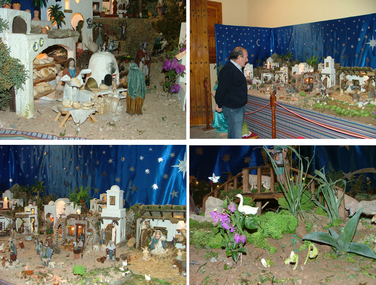 Al frente del Belén de la Cofradía de la Oración en el Huerto se encuentra todos los días quien fuera su antiguo hermano mayor, Antonio Ruiz Sánchez. Antonio hombre de fe y de trato agradable se muestra totalmente complaciente con todo aquel que entra en la casa de hermandad para ver el Belén y ha comentado a EL FARO las particularidades del mismo. Según cuenta, siente una especial predilección por esta época del año y su tradición belenistica arranca de bastantes años atrás. Desde su juventud ha ido coleccionando figuras del Nacimiento que ha cuidado con mimo al objeto de montar el Belén para uso exclusivo de su familia . Cada año incorporaba algo nuevo, una vivienda, algún romano, personajes hebreos, animales de granja…, el caso es que el Belén fue creciendo de tamaño y hubo un momento en el que ya no cabía en su comedor. De ahí salió la idea de erigirlo en la casa hermandad, tarea que desempeña con especial cuidado su mujer, María José Blanco, que es su diseñadora y que cada año le confiere una escenografía singular para huir de la monotonía. Este año el Belén ocupa aproximadamente ocho metros cuadrados de espacio y constituye una autentica delicia para los ojos y el sentimiento cristiano. El pasaje tiene su orden y concierto; comienza con el peregrinar de los Reyes de Oriente que portan sus ofrendas subidos a sus camellos junto a un oasis florido. A su lado se encuentra el castillo de Herodes con su guardia romana y escenas cotidianas de labores agrícolas y pastoriles. Aquí se ha cuidado tanto el detalle que se puede contemplar, por ejemplo, una encarnizada lucha de dos carneros o una mujer hebrea que ordeña a una vaca. Tras cruzar el puente sobre el río se puede ver el Nacimiento con figuras de mayor porte que exhiben al Niño Dios en el pesebre acompañado de su madre, la Virgen María, San José y dos ángeles. La estructura bajo la cual se encuentran tiene luz eléctrica, lo que contribuye a darle un especial fulgor. Mas abajo continua la vida cotidiana de la aldea con pastores, ganaderos, artesanos…etc., por haber hay hasta una castañera que ofrece este producto típico de la época. Es tal su realismo que se puede contemplar como en el pequeño huerto instalado han florecido semillas que ya se encuentran germinadas.