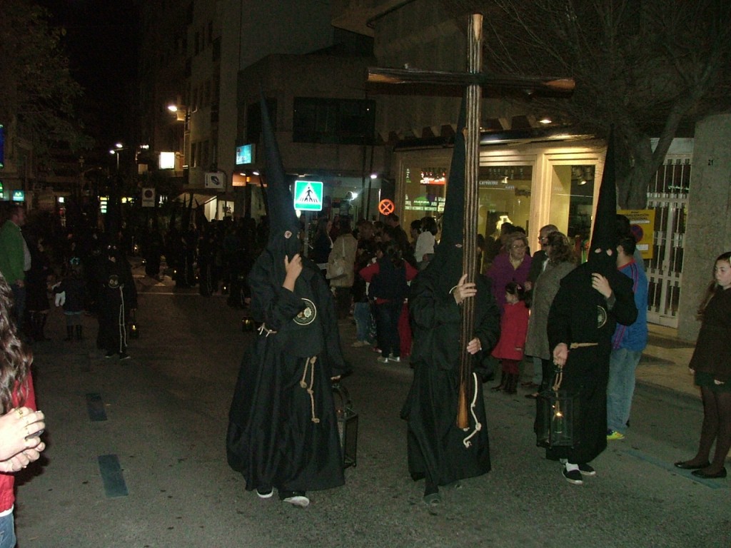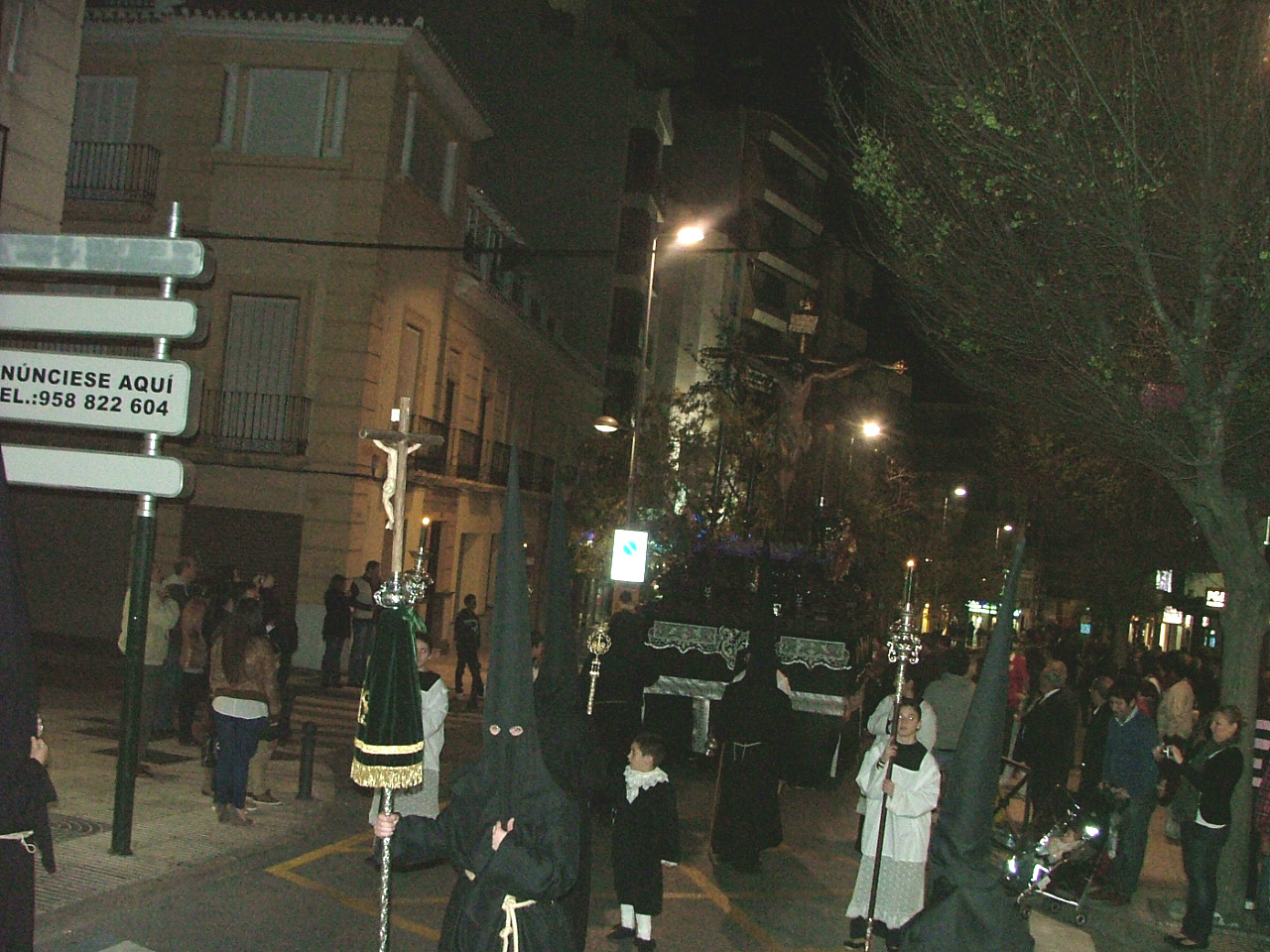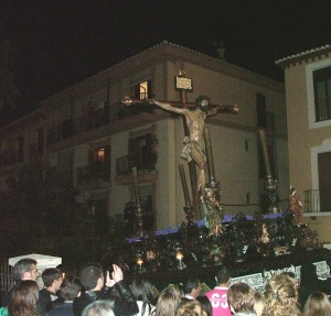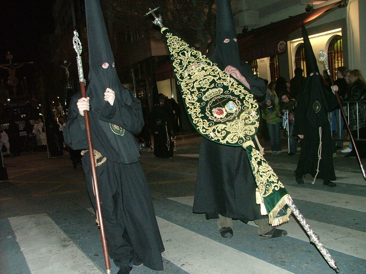 Tal como estaba anunciado, la Archicofradía del Dulce Nombre de Jesús ponía en la calle su cortejo penitencial a las 20:30 hrs. Lo hacía desde su sede canónica, la iglesia Mayor de la Encarnación, templo en el que se veneran sus dos titulares, el Santo Cristo de la Expiración y María Santísima del Valle, aunque ésta última desde hace unos años no figura en el cortejo. Abren la marcha dos muñidores tañendo una campana en señal de la proximidad del séquito, la cruz guía y dos filas de penitentes que portan faroles en las manos. Junto a ellos, el libro de reglas y la popular “Bacalá”, insignia que no pudo ser estrenada el año anterior por causa de la suspensión de la estación de penitencia. A continuación se dispone la cruz parroquial con manguilla, cuerpo de cuatro ciriales y el incensario. Finalmente el paso del Cristo de la Expiración sobre un fino tapiz de iris morado en el que se yergue majestuosa la imagen que tallara el escultor Raúl Trillo en 1999. Como es costumbre en esta cofradía desde su fundación no figura acompañamiento musical alguno.