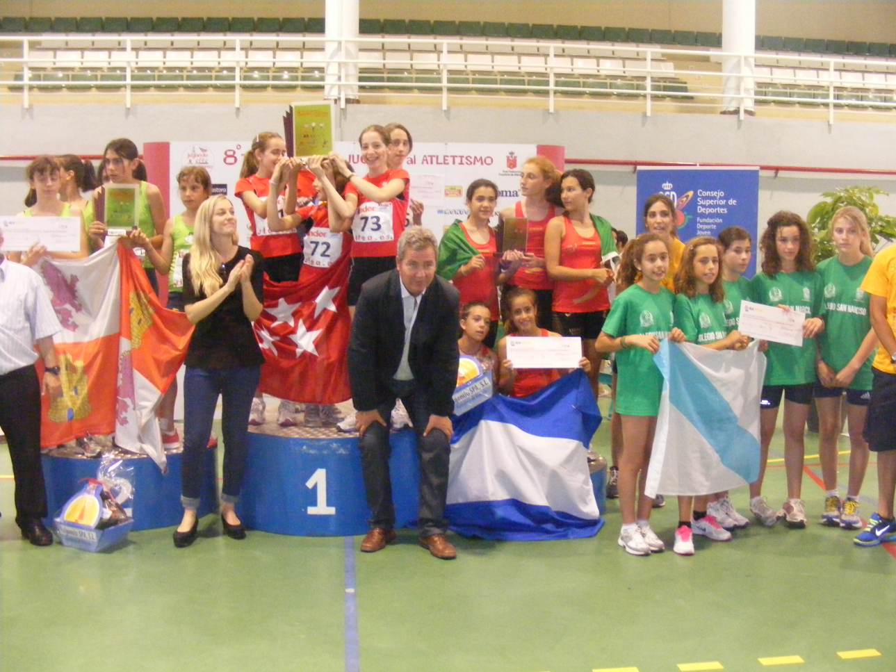 El teniente de alcalde de Deportes del Ayuntamiento de Motril, José García Fuentes, junto a José García Grossocordón, en representación de la Real Federación Española de Atletismo, presidió el sábado la entrega de medallas de la final del VIII Torneo Nacional “Jugando al Atletismo”, una entrañable cita deportiva que se ha celebrado a lo largo de este fin de semana en nuestra ciudad y en la que han participado 190 alumnos de 38 centros escolares de toda España.