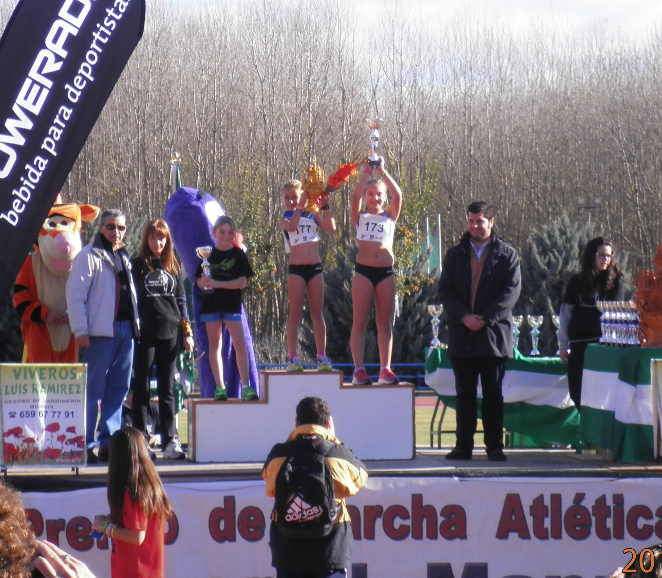 Con las alevines,  nuestras atletas obtienen un magnifico doblete, con Tabatha Peña Martín en segunda posición y la victoria, a la que nos tenemos que ir acostumbrando, de la marchadora Lola Jiménez Correa, que se trae el preciado trofeo, una jarra accitana realizada en cerámica, para Motril como premio. Ya comentamos en la crónica de la prueba de Toledo que estas atletas, que se van iniciando en la marcha atlética, apuntaban unas formas buenísimas para esta dura especialidad: combinan técnica y elasticidad una, técnica y fuerza otra. Tan distintas como complementarias.