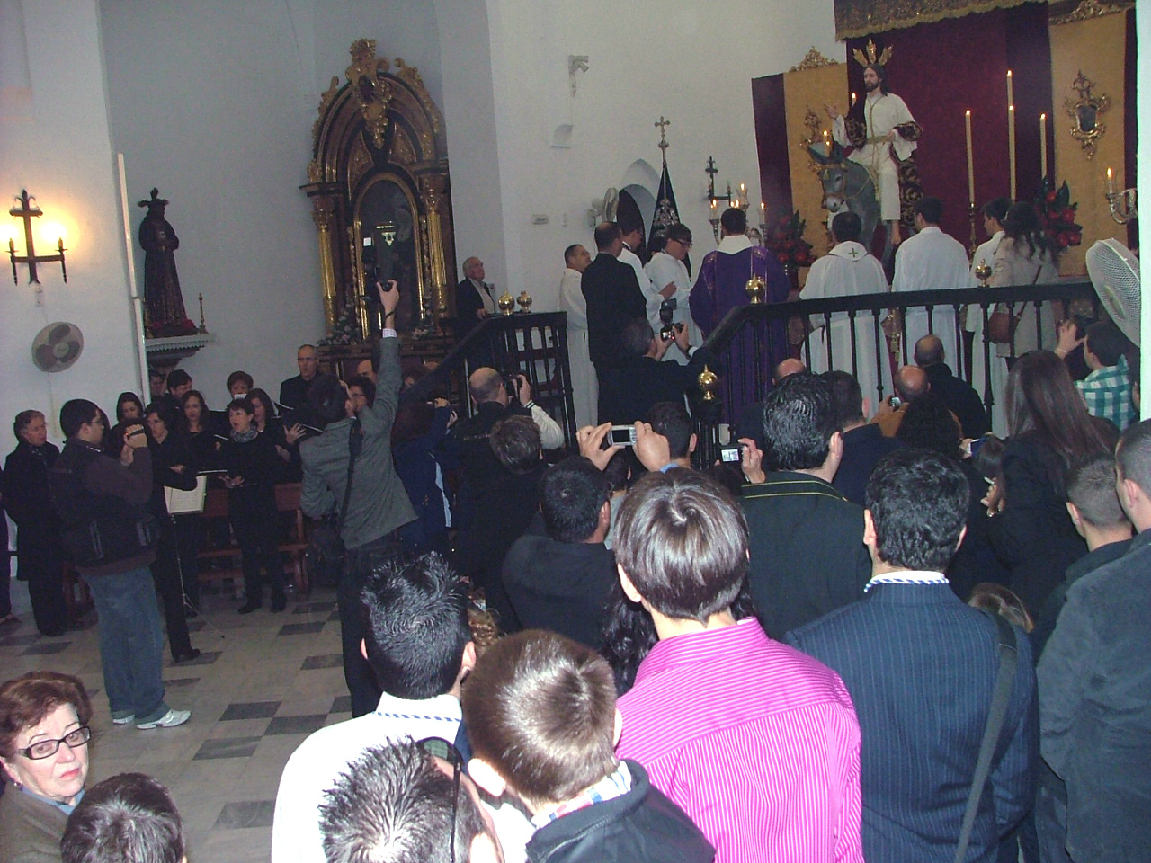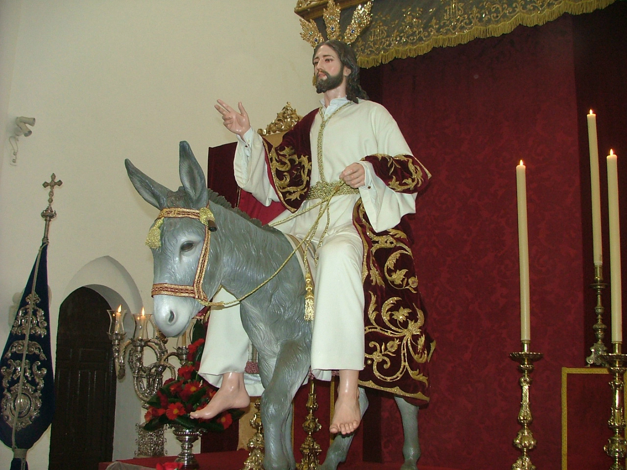 La efigie llegaba a nuestra ciudad el pasado 10 de febrero procedente de Madrid, capital hasta donde se había desplazado una nutrida representación de su junta de gobierno para efectuar el traslado. Durante prácticamente una semana el Señor de La Borriquita ha permanecido en la casa hermandad y ha sido muy escaso el número de personas que han podido contemplarle con detalle. Precisamente el día del traslado a la iglesia, el sábado 16, los costaleros de la hermandad tuvieron el privilegio de hacerlo en primicia, gesto que agradecieron y que provocó al momento una sonora salva de aplausos. En la mañana del domingo se celebraba en el templo parroquial la solemne función de iglesia para su bendición, templo que se hizo insuficiente para albergar a la ingente cantidad de fieles que se congregaron a su encuentro. La sagrada eucaristía fue presidida por el vicario territorial, D. Juan Bautista Amat, en unión del párroco, D. José Albadalejo Hernández, y el motrileño D. Javier Sabio, actual párroco de Válor y persona a la que le unen fuertes vínculos con la hermandad desde su infancia. En la homilía el vicario agradeció esta iniciativa y puso de relieve el papel que tienen las imágenes en la catequesis de la iglesia, además de trasmitir la significación del pasaje bíblico en que Jesús accede a Jerusalén como rey y Mesías a lomos de una borriquita. Jesús es fuente de verdad y tuvo una vida llena de dificultades y sufrimiento hasta alcanzar el sitio del Padre y es por ello por lo que dijo que ha de ser el espejo en el que se miren los hombres.