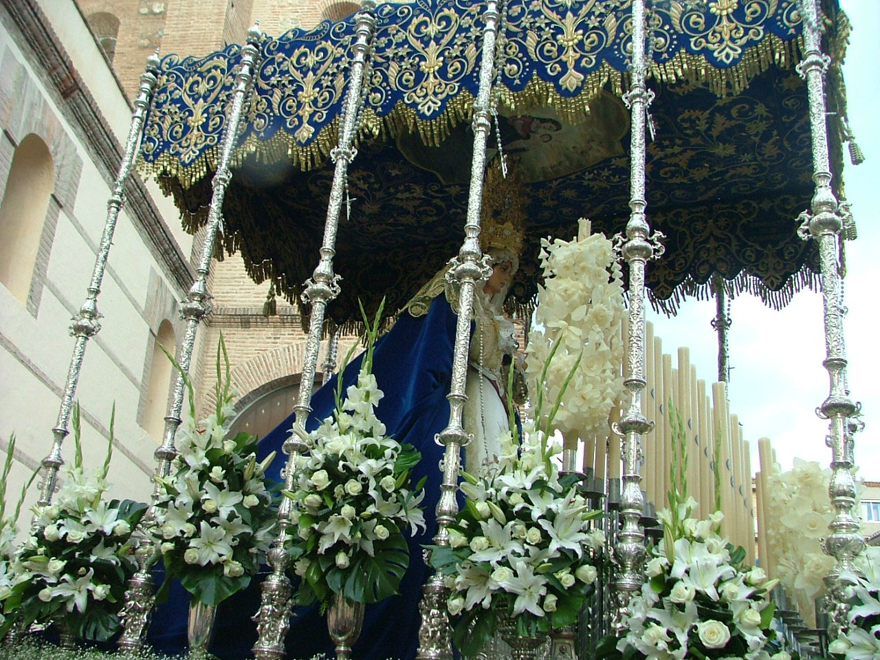Tal como estaba anunciado, a las 17:00 hrs de la tarde hacía acto de presencia por la puerta lateral de la iglesia de la Encarnación la cruz guía junto a los faroles del frente de procesión. Inmediatamente detrás se ubica la sección de niños hebreos que portan palmas y ramas de olivo para significar la llegada de Jesús a Jerusalén. El séquito realmente impresiona por sus proporciones y número de componentes, valor en alza que ha hecho multiplicar los encargos de vestimentas en el propio taller de bordado. La sección de Cristo Rey se disponía a continuación con el Senatus romano a la cabeza para dar paso a las filas penitenciales en las que se hace destacar con luz propia el color azul de los capirotes y el blanco de las túnicas de hermanos. Como todos los años la presidencia oficial va ostentada por una representación de la hermandad del Gran Poder, confraternidad con la que se encuentra hermanada desde hace años la cofradía de la Borriquita y, tras ella, el cuerpo de acólitos ceriferários con su pertiguero al centro y auxiliares femeninos portando el incensario y naveta. Inmediatamente detrás marcha el paso de misterio con la nueva imagen de Cristo Rey que ha sido tallada por el escultor jiennense Antonio José Martínez Rodríguez. El paso es comandado por su capataz, Francisco Pérez Lorenzo y figuran en su interior treinta y cinco costaleros que discurren en modalidad de trabajadera sevillana. Tras el trono, la representación eclesiástica que personifican la figura del párroco de la Encarnación, D. José Albadalejo y el diácono Moisés Fernández. Finalmente, marcando el paso, la recién unificada Banda de Cornetas y Tambores de Nuestra Señora del Rosario y Santa Ana.