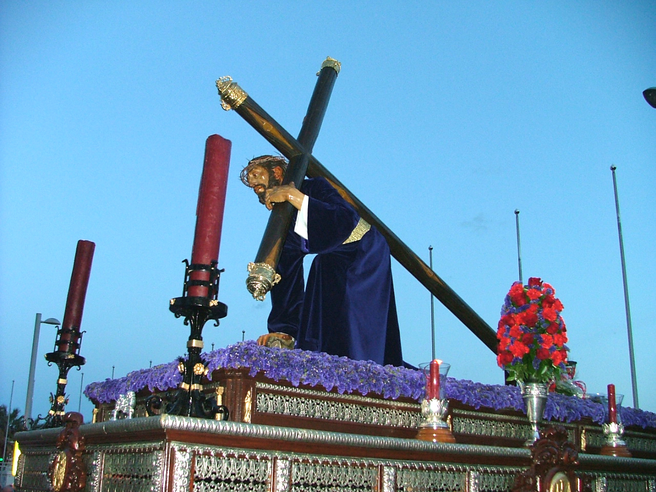 El cuerpo de acólitos ceriferarios precede al paso de misterio que marcha espléndidamente exornado sobre un tapiz de «statis» lila que realza poderosamente la figura de Cristo, que en esta salida procesional estrena túnica lisa de color azulón que han donado varios hermanos de la hermandad. La imagen es obra del escultor granadino Antonio Barbero Gor y fue realizada en 1986 siguiendo las prescripciones de la entonces junta de gobierno que querían representarle en una de las caídas en el Monte Calvario. Precisamente su salida del templo constituye un momento emotivo y pleno de sentimiento pues los costaleros, diezmados en su número, han de salir a gastas sobre el terreno en una siempre complicada maniobra que ha de salvar el desnivel y los márgenes del propio pórtico. En esta ocasión el paso estrena capataz, el joven cofrade Carlos Monferrer, que asiste con su voz de mando a veintidós costaleros bajo el mismo y que incorpora como asistente a Manuel Arquero Escañuela.