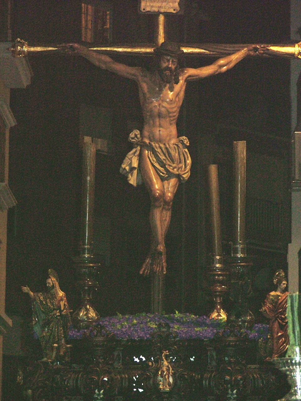 El recorrido procesional dispuesto por la junta de gobierno de la cofradía para este año ha partido desde la iglesia Mayor, donde a la hora fijada para la salida penitencial ya se había concentrado un enorme gentío dispuesto en toda la extensión para ver pasar al crucificado titular en una marcha que habría de continuar por Plaza de España, Romero Civantos, Plaza Díaz Moreu, Emilio Moré (Carrera Oficial), Plaza de las Palmeras, Cruz Verde, Plaza Bustamante, Teatro, Nueva, Cuatro Esquinas, Mercado Alto y Cañas, Federico Gallardo, Placeta del Sol, Curucho, Plaza Canalejas, Catalanes, Plaza Díaz Moreu, Romero Civantos, Plaza de España y de aquí el regreso al templo, que se ha verificado a las 23:30 hrs de la noche. En suma, un cortejo serio y ordenado que ha hecho transcurrir la estación de penitencia sin ningún tipo de incidente, a excepción del fuerte viento reinante que ha provocado que los hachones del paso permanezcan apagados en la mayor parte del recorrido. Momentos significativos de la estación de penitencia han sido, sin duda, la salida desde la iglesia parroquial y su complicada operación de bajada por las escalinatas, el paso siempre solemne por la tribuna oficial y, particularmente, el tránsito por la calle Mercado Alto, donde las cantoneras de la cruz han tenido que sortear milimétricamente las barras de una balconada, operación que ha sido seguida con expectación por el público presente. Por suerte, a la hora de haberse clausurado la estación de penitencia, la lluvia hizo acto de presencia haciendo descargar sobre la ciudad un intenso aguacero, aunque las calles permanecían ya libres de personas.