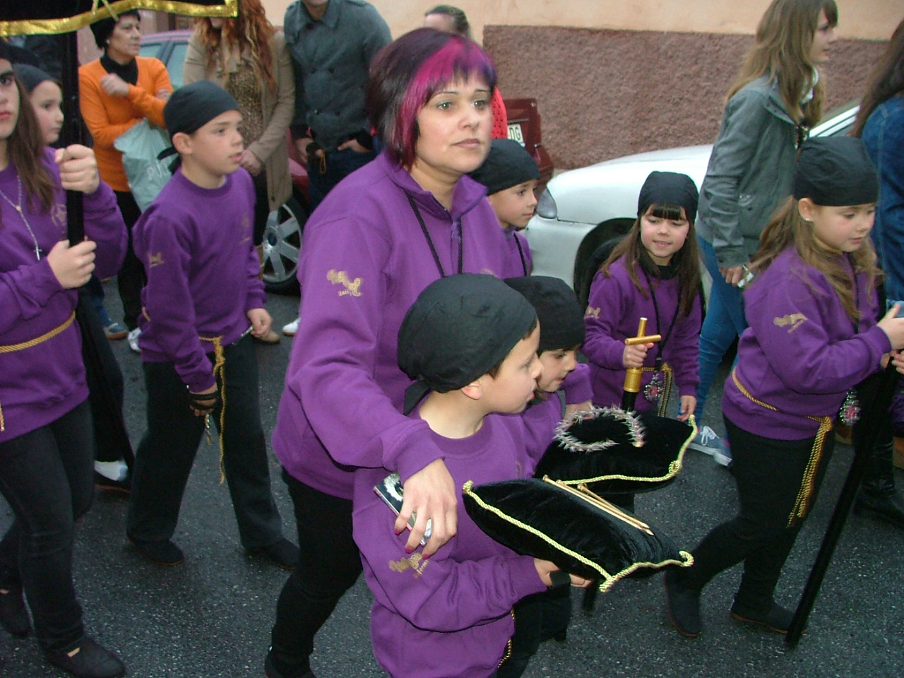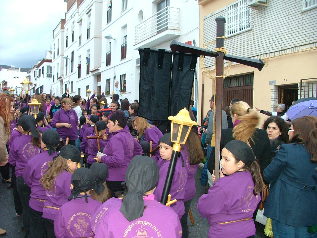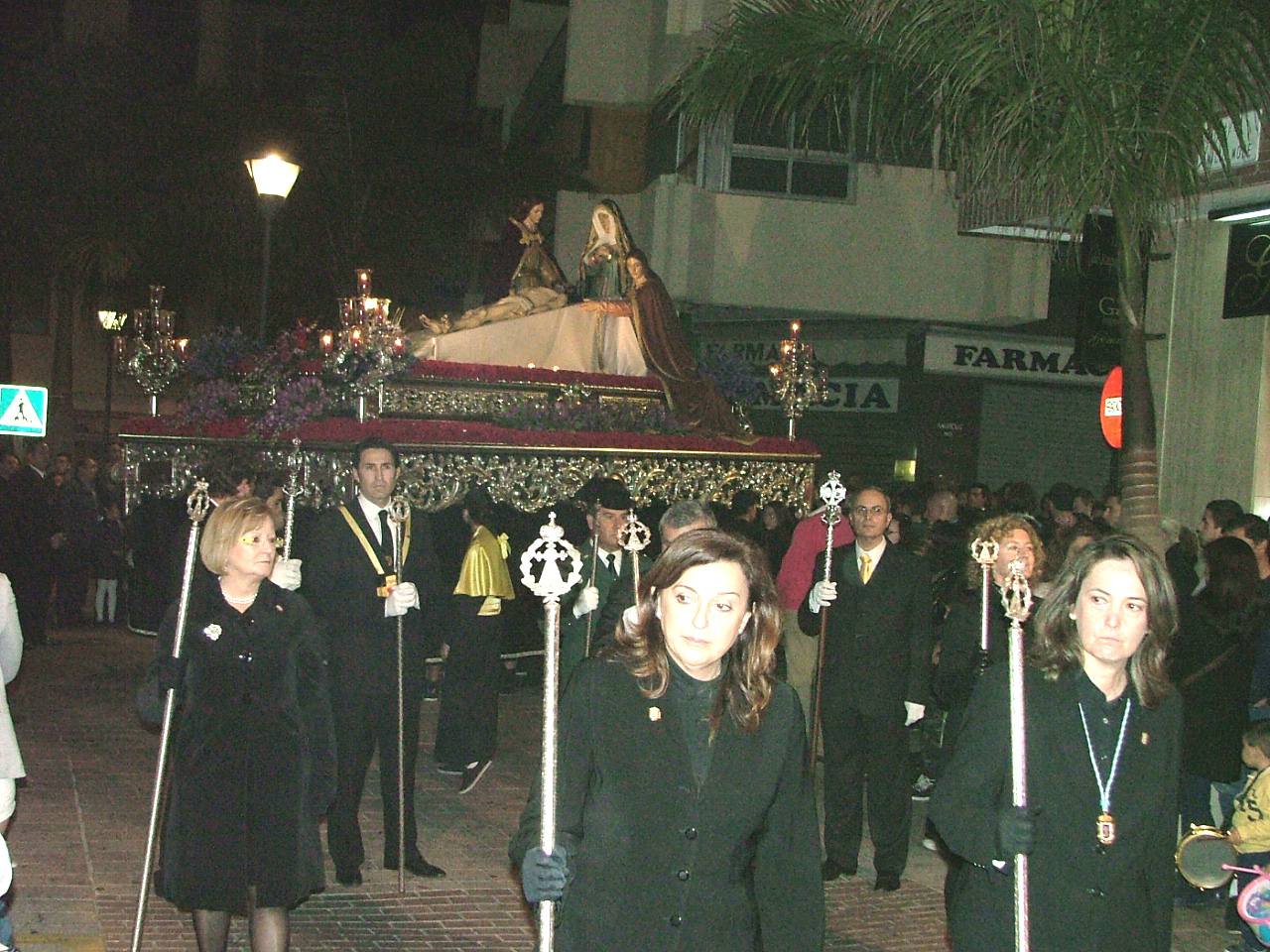 Con la puntualidad de que siempre hace gala, el cortejo penitencial comenzaba a organizarse en la calle Santa Ana desplegando a su frente la cruz guía y los tres faroles que le dan escolta, para disponer a continuación a un nutrido tramo infantil con pequeñas cruces y atributos de la pasión. Marchan supervisados por sus correspondientes diputados «paveros» y le siguen los banderines de sección que abren las filas de hermanos de luz portando farolillos encendidos, el estandarte del Cristo Yacente escoltado por mazas y la figura tradicional de la «Chia» flanqueada por las típica bocinas que han de anunciar el cortejo fúnebre del Hijo de Dios. Tras ellos, una amplia representación de la Agrupación de Voluntarios de Protección Civil, dos hermanos de la hermandad de Jesús de Pasión, confraternidad con la que se halla hermanada la cofradía, y miembros del Benemérito Cuerpo de la Guardia Civil. En un tramo posterior el equipo de gobierno municipal prácticamente al completo y la comisión de la Agrupación de Hermandades y Cofradías de la ciudad.