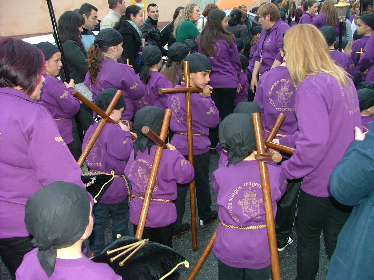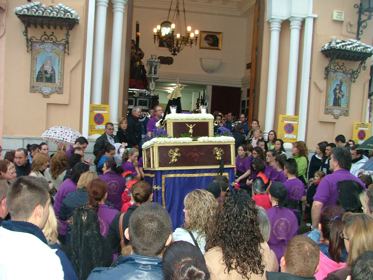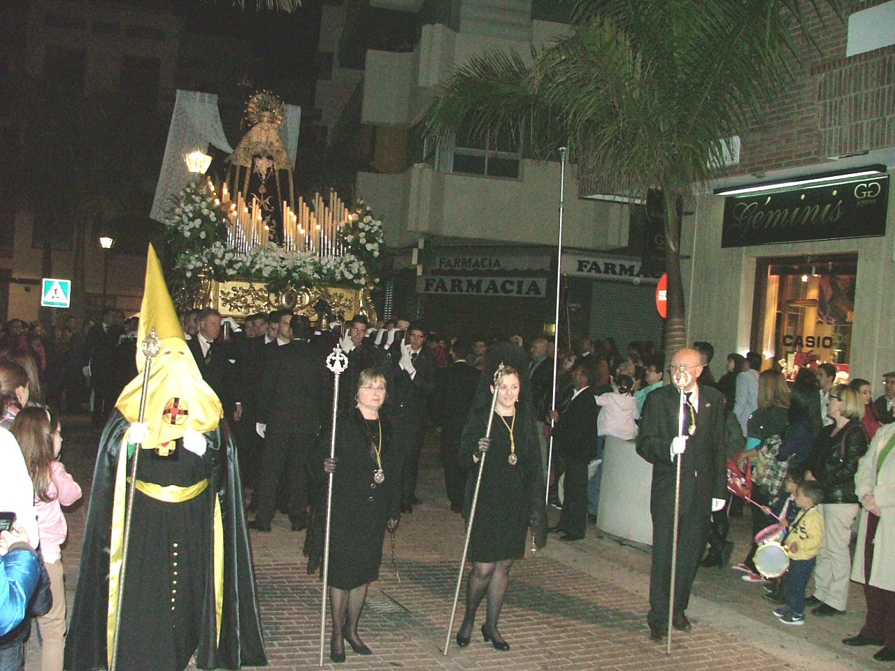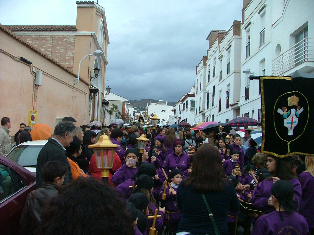Con la puntualidad de que siempre hace gala, el cortejo penitencial comenzaba a organizarse en la calle Santa Ana desplegando a su frente la cruz guía y los tres faroles que le dan escolta, para disponer a continuación a un nutrido tramo infantil con pequeñas cruces y atributos de la pasión. Marchan supervisados por sus correspondientes diputados «paveros» y le siguen los banderines de sección que abren las filas de hermanos de luz portando farolillos encendidos, el estandarte del Cristo Yacente escoltado por mazas y la figura tradicional de la «Chia» flanqueada por las típica bocinas que han de anunciar el cortejo fúnebre del Hijo de Dios. Tras ellos, una amplia representación de la Agrupación de Voluntarios de Protección Civil, dos hermanos de la hermandad de Jesús de Pasión, confraternidad con la que se halla hermanada la cofradía, y miembros del Benemérito Cuerpo de la Guardia Civil. En un tramo posterior el equipo de gobierno municipal prácticamente al completo y la comisión de la Agrupación de Hermandades y Cofradías de la ciudad.