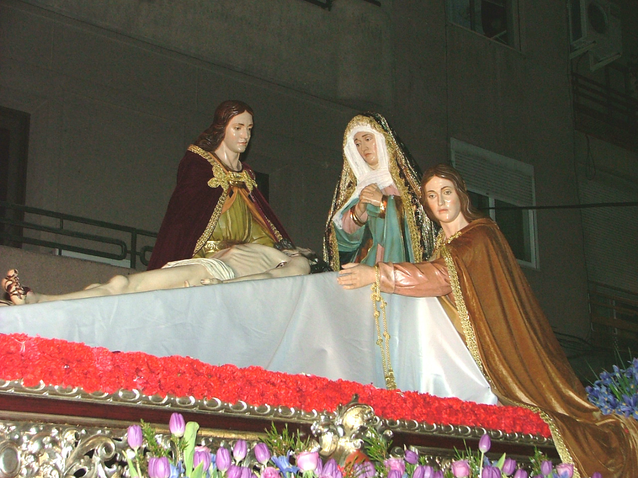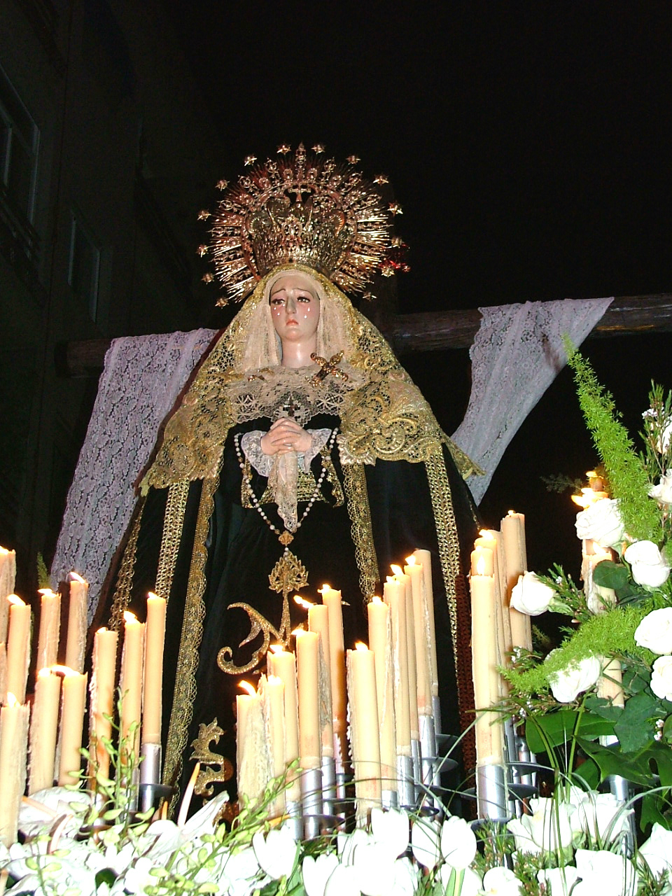 Iconográficamente se le representa al pie de ella, generalmente posada a sus espaldas y con el sudario blanco colgado de sus brazos. Por tanto, un momento concreto de la pasión del Señor que es previo a la gloria de su resurrección. Pues bien, con un horario nada habitual y bastante tardío con respecto a otros años, efectuaba su estación de penitencia la Cofradía de Nuestra Señora de la Soledad y Santísimo Cristo Yacente en ese sábado santo en el que curiosamente y en la madrugada culminaría el horario invernal.