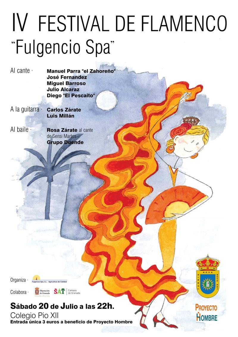 El sábado por la noche se podrá disfrutar del cante, baile y guitarra de consagrados y promesas que se unen en la cuarta edición del Festival Flamenco ‘Fulgencio Spa’ a beneficio de Proyecto Hombre.Con entrada-donativo de 3 Euros, en taquilla, a beneficio de Proyecto Hombre y en el entorno del Colegio Pío XII de Torrenueva; así celebra este Sábado su cuarta edición el Festival Flamenco ‘Fulgencio Spa’, organizado y patrocinado por la empresa hortofrutícola Fulgencio Spa S.L. con la colaboración de la Entidad Local de Torrenueva y la Diputación de Granada.