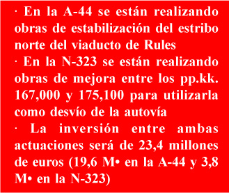 El tramo de la carretera N-323, entre los pp.kk 167,000 y 175,100, que se utilizará como desvío durante la fase 2, se encuentra actualmente deteriorado, y para habilitar un desvío seguro y con capacidad suficiente para absorber el tráfico que circula por la autovía A-44, se van a llevar a cabo las actuaciones de reparación necesarias para que la carretera tenga las condiciones de seguridad y funcionalidad suficientes.
