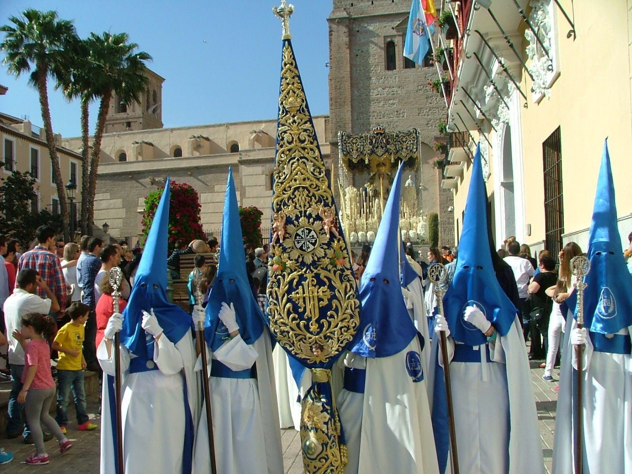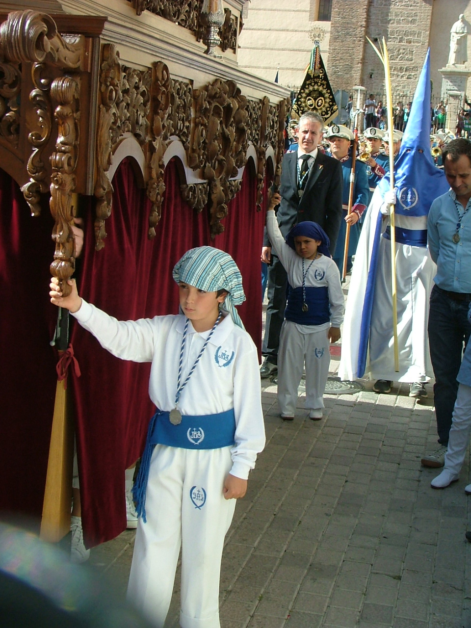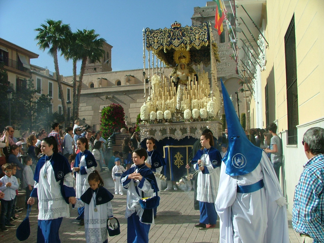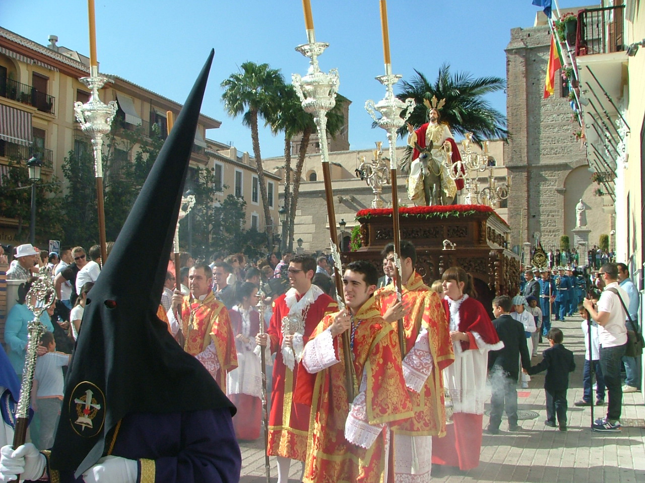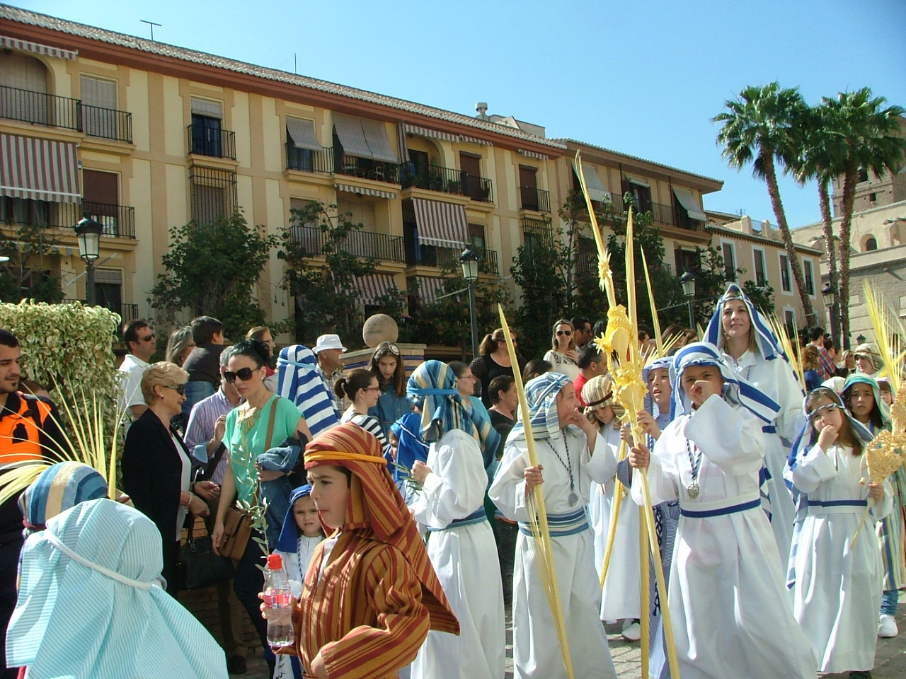 Igualmente, a media mañana del sábado, quedaba ultimada la rampa de madera que facilitará el tránsito de los dos pasos procesionales que exhibe esta hermandad en la calle. Este año la infraestructura ha sido sufragada por las dos hermandades que harán uso de ella, la Borriquita y la de Jesús del Perdón, ésta última inaugurando novedosamente su salida penitencial desde el templo Mayor. Como viene siendo tradicional las palmas y ramas de olivos que reciben triunfalmente a Jesús en la Borriquita han sido bendecidas en la mañana del domingo en la plaza del Tranvía, iniciándose a continuación una marcha procesional que llevó a los fieles presentes hasta el templo de la Encarnación para asistir a la eucaristía del día.Con la puntualidad de que hace gala la Hermandad de Nuestro Padre Jesús en su triunfal entrada de Jesús en Jerusalén, a las 17:00 hrs daba comienzo el cortejo penitencial tras abrirse la puerta ubicada en el crucero de la iglesia. De impresionante hay que calificar la respuesta del público motrileño apostado en los aledaños y la plaza de España para contemplar el variopinto séquito de hermanos cofrades en los que se imprime con calidez el color azul y blanco propio de la hermandad. Desde luego hay que calificar de total acierto el traslado de la estación de fe a la iglesia de la Encarnación ya que ha ganado en prestancia y seriedad, a la vez que sintetiza en el corazón urbano de la ciudad el paso de su extensa comitiva, una de las más nutridas de nuestra semana mayor. Tras la disposición de la cruz guía, el siempre atrayente y multitudinario grupo de niños hebreos y la extensa sección «cristífera» ataviada con las palmas bendecidas en la mañana, se disponía el impresionante paso de Jesús a lomos de la borriquita, cuya imagen original es obra del escultor Antonio José Martínez Rodríguez. Este año, como novedad, figura expuesto sin las imágenes secundarias de los populares «carrasquillos», destacando igualmente el llamativo exorno floral de claveles rojos sobre un tapiz de romero expresamente recogido por los hermanos para la ocasión. La imagen de Jesús estrena igualmente la flamante túnica que le cubre, que ha sido bordada en el taller de la propia hermandad.
