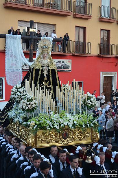 Por lo que respecta al tramo de la Virgen de la Soledad, aparece éste con tres faroles de frente de procesión seguido de jóvenes hermanos penitenciales y las filas nazarenas que enlazan con la sección del siempre ordenado cuerpo de madrinas de la Virgen. Ultimado éste se apresta una presidencia que componen la camarera mayor, su antecesora en el cargo y ex-hermana mayor de la cofradía y el párroco de Capuchinos, D. Diego Molina, aunque éste, como viene siendo habitual, abandona el cortejo al aproximarse a su templo. Nuestra Señora de la Soledad muestra en su expresión el semblante triste y abatido de una Madre tras contemplar el cuerpo de su Hijo muerto y descendido de la cruz y como viene siendo habitual ha sido aderezada en su ornato por el vestidor motrileño Antonio Hernández. La imagen es de autor desconocido y data del siglo XVIII, habiendo recibido culto en el templo que le acoge tras la restauración acometida en los años de posguerra. El porte malagueño es el que caracteriza la marcha de este emotivo paso mariano que sigue a los sones de la Banda de Música de Nigüelas y que tradicionalmente sostiene su propio cuerpo de portadores.
