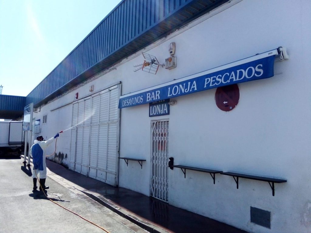 El Consistorio ha desinfectado los exteriores de la lonja pesquera a petición de la Cofradía y pese a no ser competencia municipal para asegurar esta actividad esencial con las máximas garantías de seguridad y protección para pescadores y transportistas