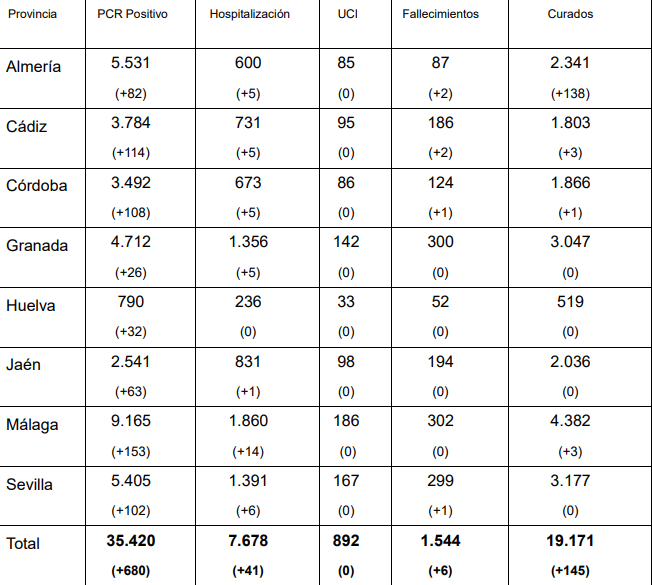 Andalucía suma 680 positivos por PCR en 24 horas y 6 muertes, en Sevilla (1) Córdoba (1), Almería (2) y Cádiz (2).