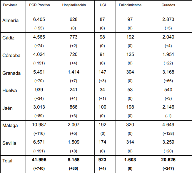 Por provincias: en Almería (66 hospitalizaciones, de los que 13 en UCI), Cádiz (114 hospitalizaciones, de los que 16 en UCI), Córdoba (89 hospitalizaciones, de los que 15 en UCI), Granada (97 hospitalizaciones, de los que 11 en UCI), Huelva (4 hospitalizaciones y ninguno en UCI), Jaén (39 hospitalizaciones, de los que 7 en UCI), Málaga (221 hospitalizaciones, de los que 32 en UCI) y Sevilla (188 hospitalizaciones, de los que 18 en UCI).