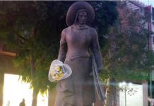 La estatua que preside la rotonda de entrada a Motril luce esta tarde un ramo de flores en su mano derecha