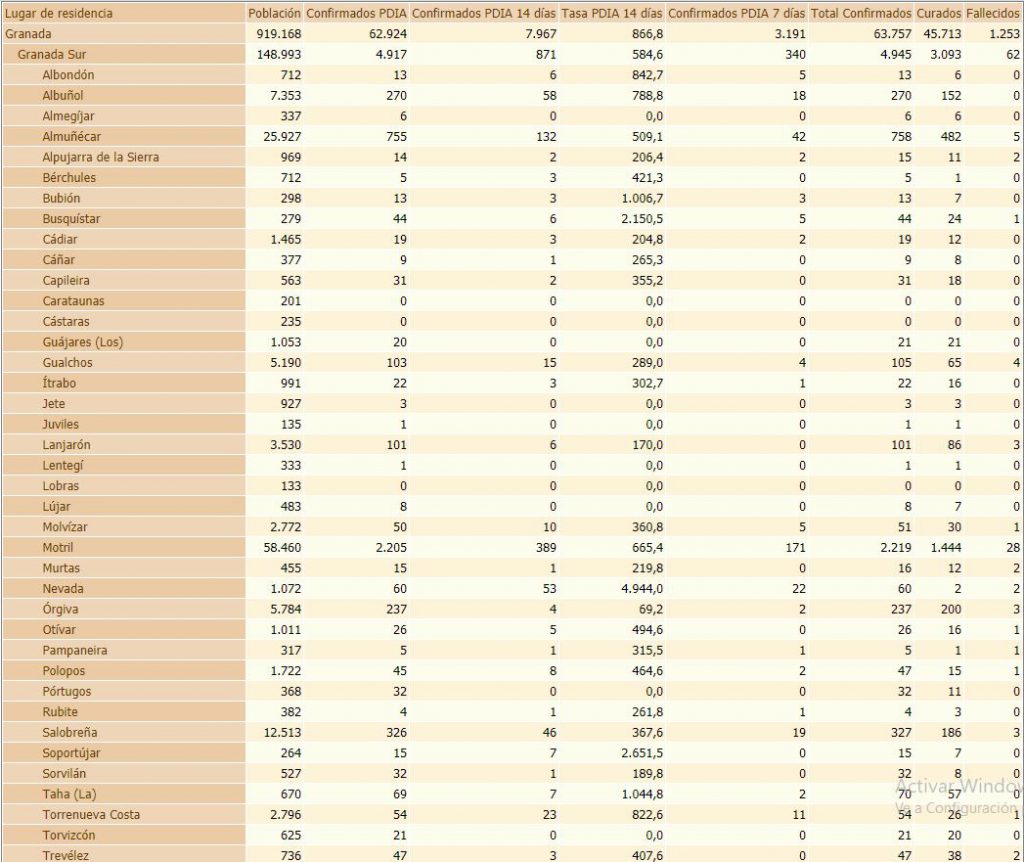 Motril suma 25 contagios, por lo que acumula 171 casos en la última semana y 389 contagios confirmados en los últimos 14 días. El municipio motrileño ha registrado 2.219 contagios y 28 fallecidos desde el comienzo de la pandemia, contabilizando este miércoles una tasa de 665,4 contagios por cada 100.000 habitantes, 15 puntos menos que ayer martes. El resto de municipios que han dado casos por coronavirus son: Albuñol 3, Almuñécar 9, Alpujarra de la Sierra 2, Bubión 1, Pampaneira 1, Salobreña 2, La Taha 1 y Ugíjar 1.