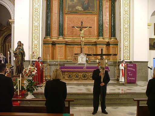 Tal como estaba programado, el rezo del Santo Vía Crucis se ha iniciado a la conclusión de la eucaristía que ha oficiado el párroco de la iglesia de la Encarnación, D. José Albaladejo. Puntualmente, a las 20:45 hrs., ha accedido al altar D. Carlos Medina, vocal de cultos y ornato de la Agrupación de Hermandades y Cofradías de Semana Santa, quien desde el ambón ha referido las circunstancias anómalas que por causa de la pandemia están afectando negativamente a las tradicionales celebraciones de la cuaresma y de la misma Semana Mayor. Tras finalizar sus palabras, el consiliario de la Agrupación, D. Alberto Sedano, ha principiado el rezo, al tiempo que el pequeño crucificado que recibe culto en la sacristía era llevado junto al altar para comenzar el recorrido claustral. Iniciado éste, la efigie de Cristo en la cruz ha sido conducida hasta el correspondiente icono que señala el número del pasaje de la “Vía Dolorosa” en la nave mayor, al tiempo que desde el ambón miembros representativos de las cofradías de la ciudad procedían a la lectura de la estación que correspondía a ese instante. Paralelamente, en la meditación del rezo, el consiliario de la Agrupación de Cofradías ha aludido a los momentos de sufrimientos vividos por Jesús en su pasión y ha pedido por las personas que luchan denodadamente por salvar la vida a los contagiados por el virus Covid-19, por los enfermos y por las personas desvalidas y desamparadas que son las que se encuentran expuestas con mayor incidencia a la pandemia.