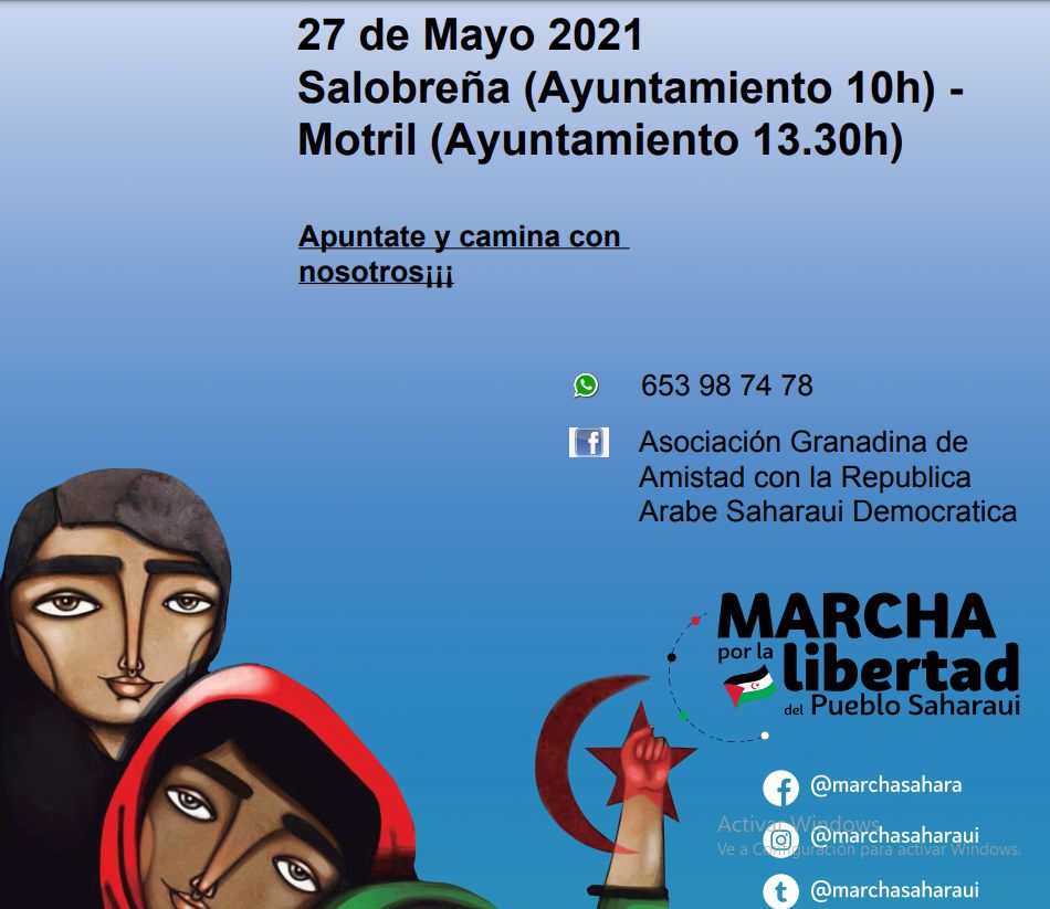 El próximo 27 de mayo la Marcha por la Libertad del Pueblo saharaui, comenzará en la plaza del Ayuntamiento de la Villa, teniendo la salida a las 10,00 horas en dirección a la localidad de Motril tras un sencillo acto con la lectura del Manifiesto de la Marcha.