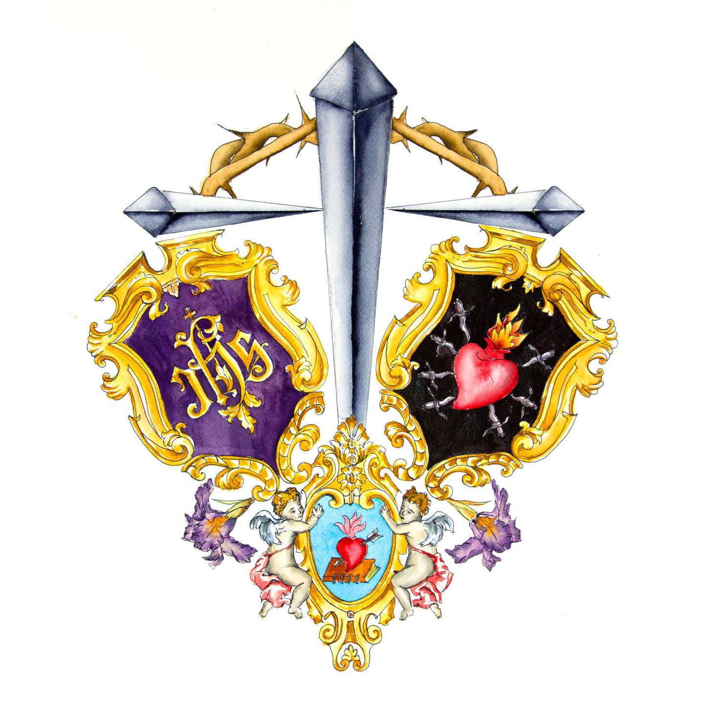 El escudo sigue estando presidido por la cruz formada por los tres clavos y la corona de espinas. En el lado derecho y sobre fondo morado la grafía «JHS» Jesús Hombre Salvador haciendo referencia al Señor del Gran Poder. Al otro lado aparece representada María Santísima del Mayor Dolor -que en el antiguo no aparecía- con un cartela con el corazón traspasado por los 7 puñales, los 7 dolores de María. En la parte inferior y soportada por ángeles, se puede ver otra cartela con el escudo de San Agustín haciendo referencia a la Orden de Agustinas Recoletas y, por tanto, a las RR.MM. Nazarenas. También encontramos dos flores de iris, flor muy representativa de la Hermandad y que con frecuencia se utiliza en los exornos florales.