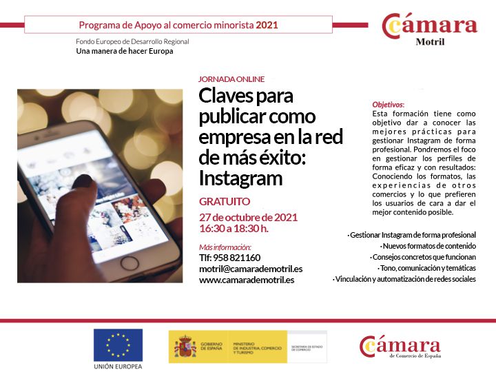 La Cámara de Comercio de Motril aborda una jornada online, gratuita, bajo el titulo ‘CLAVES PARA PUBLICAR COMO EMPRESA EN LA RED DE MÁS ÉXITO: INSTAGRAM’ dentro del Programa de Apoyo al Comercio Minorista 2021, cofinanciado por la Secretaría de Estado de Comercio y por el Fondo Europeo de Desarrollo Regional (FEDER).