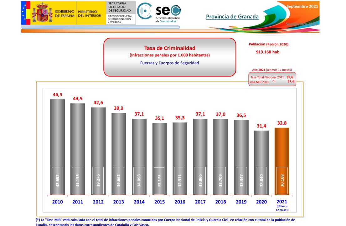 La tasa media de criminalidad en la provincia de Granada se situó en septiembre en 32,8 delitos por cada 1.000 habitantes, lo que supone situarse casi 3 puntos por debajo que la tasa andaluza, que se fijó en ese mismo mes en 35,7 y 6,8 puntos también por debajo de la media nacional, que fue de 39,6 puntos, según recoge el Balance de Criminalidad correspondiente al tercer trimestre de 2021 y elaborado por la Secretaría de Estado de Seguridad del Ministerio del Interior.