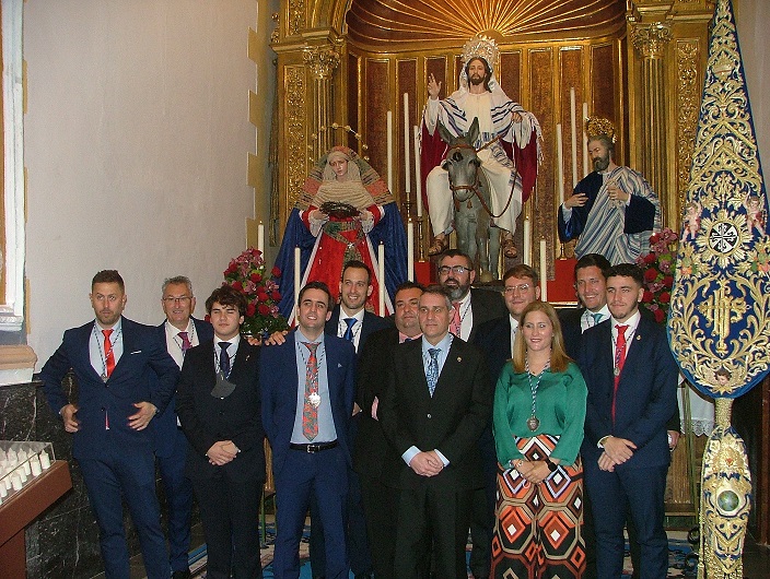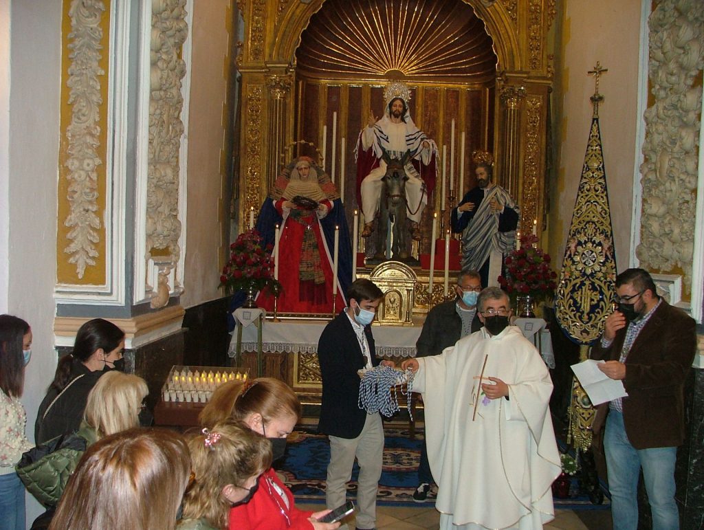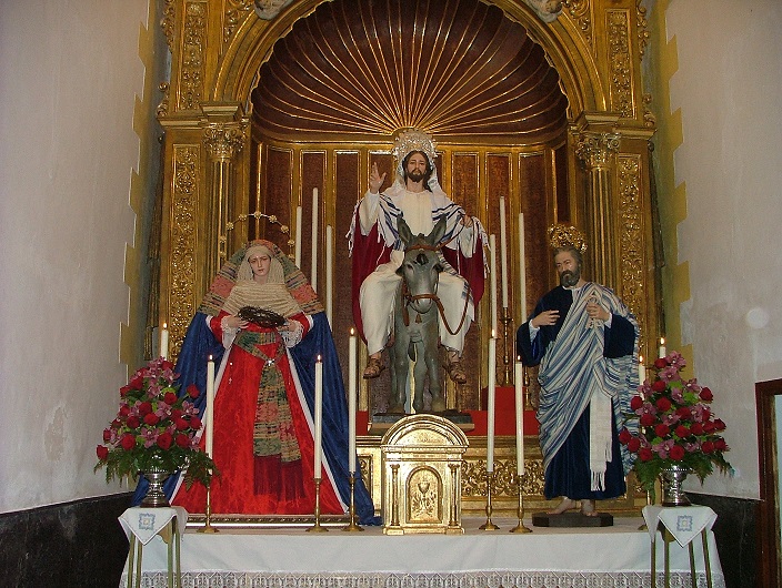 Durante varios días, la junta de gobierno de la hermandad ha estado inmersa en el ornato de la capilla titular y en el aderezo del grupo escultórico que representa su advocación. Fiel a la tradición, las imágenes han sido revestidas por sus tradicionales vestidores, Oscar Rodríguez Díaz para la Virgen del Rosario, y el sacerdote motrileño Javier Sabio Sánchez para las imágenes de Jesús y San Pedro. En su conjunto, el grupo escultórico recrea fidedignamente la entrada del Salvador en Jerusalén como rey de la Paz a lomos de una borriquilla. Concretamente, Jesús aparece tocado con un nimbo plateado que es símbolo de su realeza y un “talit” sobre sus hombros que fue adquirido en Jerusalén para aderezar su figura en tiempo de cuaresma. La Virgen del Rosario y la imagen de San Pedro muestran igualmente el atuendo hebreo, realzado en colores vivos e inmaculados para recrear esa entrada gloriosa de Jesús en tierra santa como Mesías y rey de Israel. Sobre la mesa de altar, ocho candeleros y una sencilla composición floral que es obra de la empresa motrileña “Flores Calvente”, realzan magistralmente este pasaje de la pasión con el que se inicia la Semana Santa.