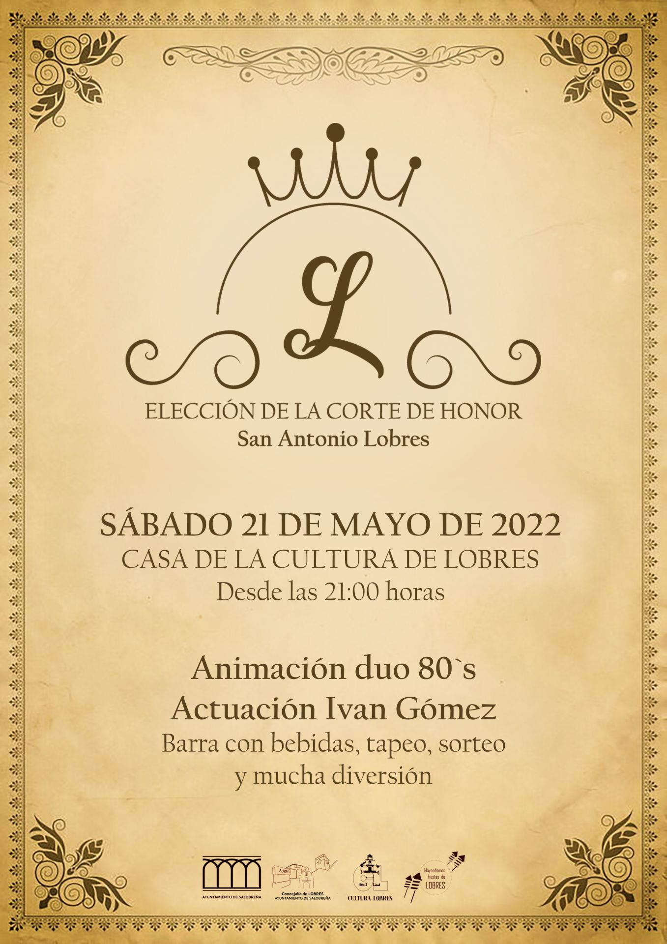 Con motivo de las Fiestas Patronales de Lobres en honor a San Antonio, este año se volverá a celebrar con normalidad la elección de la Corte de Honor. El nombramiento se hará público en una gran fiesta juvenil, que tendrá lugar el próximo sábado 21 de mayo en el recinto de la Casa de la Cultura, y que estará amenizada por el Dúo 80`s contando además con la actuación de Iván Gómez. También habrá una barra gestionada por el grupo de Mayordomos de Lobres.