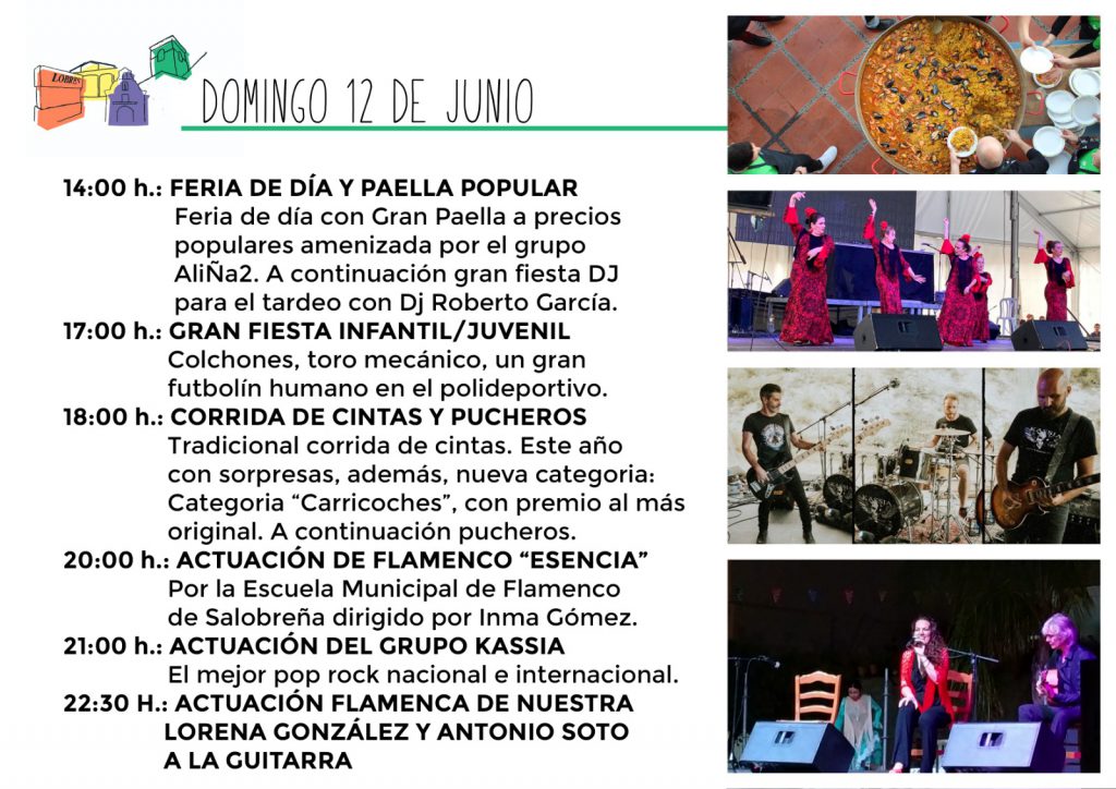 Feria de día, verbenas, conciertos para todas las edades, pasacalles a cargo de la Banda Municipal de música, las tradicionales corridas de cintas, además de la solemne procesión son algunas de las actividades previstas que, como siempre, contará con atracciones para niños. En cuanto a los fuegos artificiales, la organización ha previsto un lugar específico para su lanzamiento fuera del centro para no molestar ni a las personas ni a los animales.
