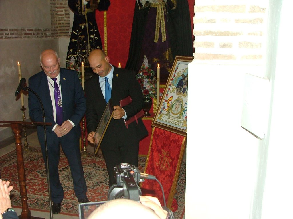 Comenzaba puntualmente el acto con la presencia del hermano mayor de la corporación, Adrián Martín, quien recordó al público presente que la principal motivación del aniversario ha sido la reafirmación de la fe en sus titulares y su implicación en fieles y devotos de la ciudad. Refirió así que esos 75 años de vida cofrade no entrañan simplemente la historia de dos imágenes de pasión, sino más bien, la reafirmación de la fe de un pueblo en sus sagradas efigies. Con el aniversario, han querido, pues concienciar a los hermanos y fieles en general en los valores religiosos, históricos y culturales de la corporación nazarena para vincularlos a la vida activa de la hermandad y potenciar su unión. En su conclusión afirmó, igualmente, que las imágenes de Nuestro Padre Jesús Nazareno y María Santísima de la Esperanza son un referente espiritual que ya forma parte del patrimonio de la ciudad, además de extender sus lazos al plano devocional, cultural y social que anida en su ámbito de influencia. Adrián Martín finalizaba su intervención con un conciso detalle de los actos celebrados desde el mes de mayo para, a continuación, ceder la palabra al presentador del pregonero, Juan Carlos Medina Martín, coordinador del programa radiofónico “A golpe de llamador”, y persona a la que unen fuertes lazos de amistad con el protagonista del día, José Santiago Martín.