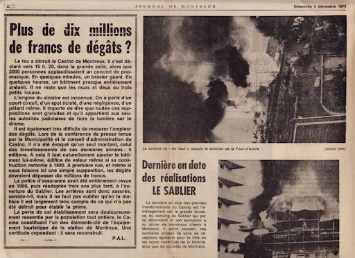 Tras unas cuantas giras ajetreadas, la mítica formación del «Mark II», la segunda de la saga de «Deep Purple” (“Púrpura Profundo”), ha llegado hasta las frías tierras helvéticas el día anterior para eludir los altos impuestos que se aplican en Gran Bretaña y grabar su nuevo disco «Machine Head». Es el sexto álbum de estudio de la banda británica y uno de los discos más influyentes del heavy metal fuera de un estudio insonorizado, en el Casino de la bella ciudad de Montreux, para lo que han alquilado la furgoneta – unidad móvil de «The Rolling Stones» “Mighty Mobile”, con estudio de grabación integrado. La banda ya ha tocado en vivo allí en 1969 y 1970 y conocen a Claude Nobs (Territet, Montreux, Suiza, 4 febrero 1936 – Lausana, Suiza, 10 enero 2013) Director de la Oficina de Turismo de Montreux y fundador del Festival de Jazz de Montreux. Se alojan en el Hotel “Eden Palace Au Lac” (Rue du Théâtre 11) y tienen 2 semanas reservadas en el Casino para grabar su próximo LP. La idea es grabar el álbum de estudio en el escenario del Casino y después dar un concierto en ese espacio y grabarlo en vivo como retribución a la gentileza de Claude Nobs; algo así como lo que hizo “Pink Floyd” en “Ummagumma”. Allí, se encuentran con Frank Zappa y su grupo «Mothers of Invention», que ese sábado, 4 de diciembre, ofrecen el último concierto de la temporada, en el escenario del mismo Casino y los «Deep Purple» no se pierden el espectáculo que comienza a las 3 P.M.