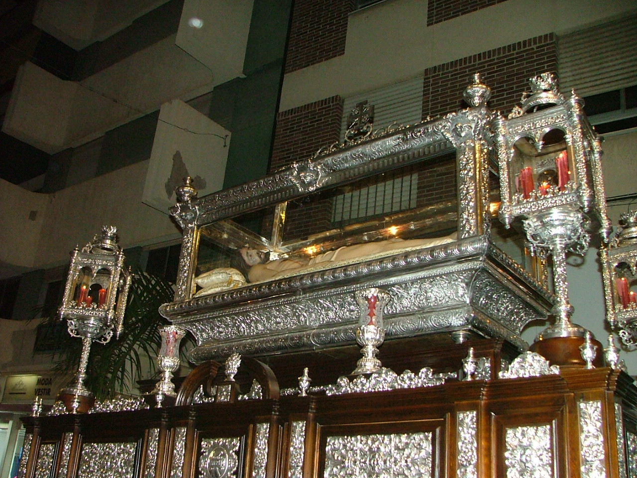 El cuerpo de ciriales e incensarios precede a continuación a dos soldados romanos que quieren significar la guardia imperial que mantuvo el sepulcro de Cristo, tras los que se hace visible el paso de la Sagrada Urna que ha sido repujada en plata en los talleres de Moreno Romera. En ella se deja ver en toda su grandeza el cuerpo del Redentor, que es obra del escultor granadino Domingo Sánchez Mesa. Soberbio y majestuoso, marcha el paso en modalidad de varal malagueño, comandado por su capataz, Francisco Rodríguez, asistido por Ignacio Ruiz en labores de contraguía. Inmediatamente detrás, el tambor que marca el paso de los hermanos portadores y el palio de respeto, cuyas varas son estreno de este año y han sido realizadas en el taller de “Orfebrería Angulo” de Lucena. Le sigue una llamativa y completa guardia romana que recuerda este novedoso paso que caracterizó a esta señera corporación del viernes santo en los años sesenta. Y, tras ellos, la representación oficial de la institución municipal, con su alcaldesa a la cabeza, que lo hace en calidad de hermanos honorarios de la corporación. Además acompañan a esta representación una comisión del Cuerpo de la Guardia Civil, Eva-9, Bomberos y Protección Civil.