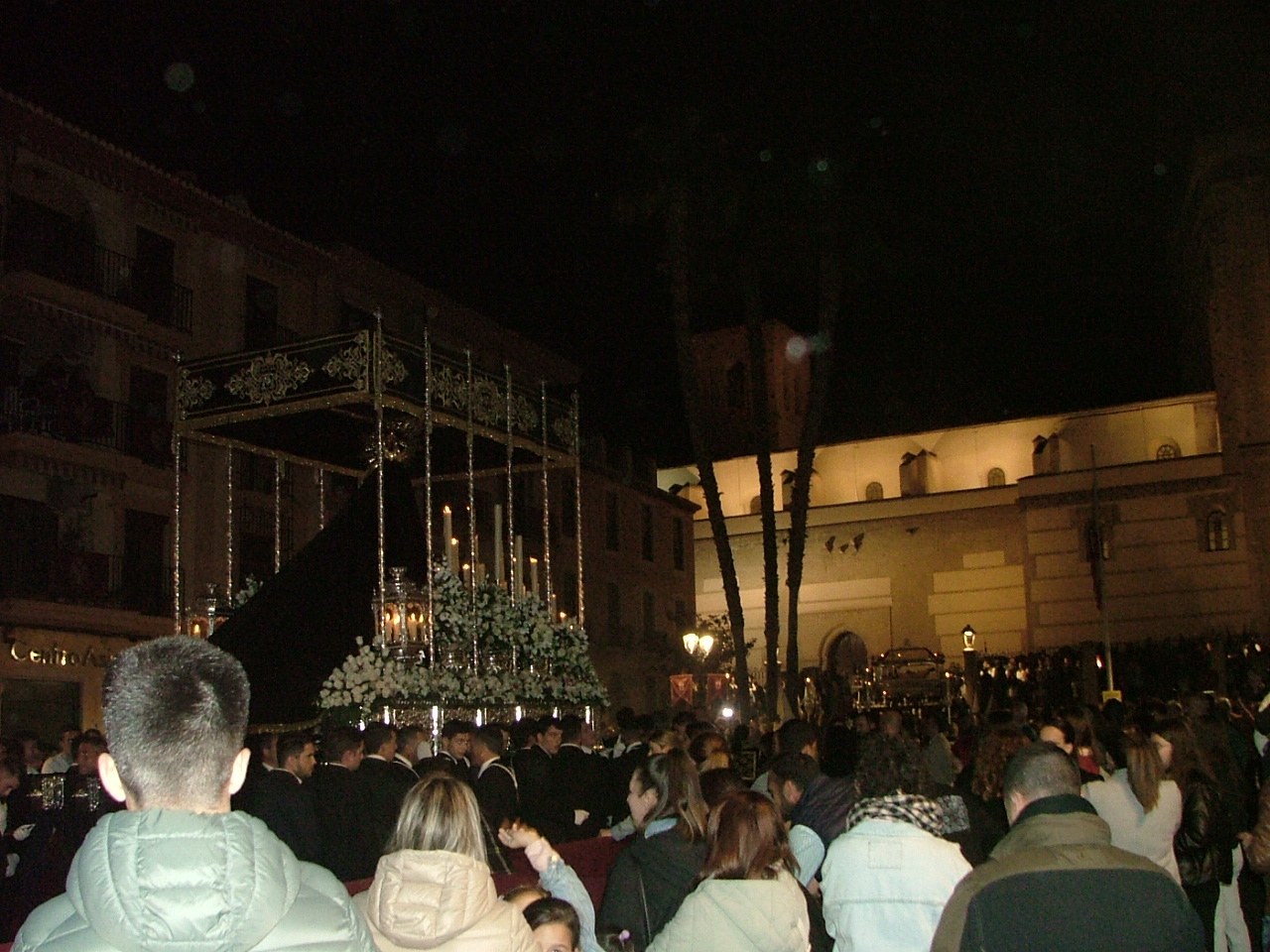 En el mencionado tramo, el cuerpo de ciriales e incensarios antecede al majestuoso paso de palio de la titular mariana, que marcha con el señorial y ordenado porte malagueño. Sobre su canastilla, con toda su candelería encendida, la imagen de Nuestra Señora de los Dolores, obra del escultor sevillano Antonio Illanes. Inmejorable y portentoso el aderezo que le ha conferido a la titular su tradicional vestidor, Abrahán Ortega Moreno, que exhibe en su pecho el símbolo del corazón traspasado por siete puñales que ha sido realizado por los talleres de Moreno Romera y donado por un hermano, Noah Martín. Asimismo, la placa de San Hermenegildo que ha sido ofrenda de D. Fernando Troyano y el fajín militar que le ha donado el general D. Juan Carlos Medina Fernández. Estrena, igualmente la Virgen el nuevo techo de palio, que ha sido diseñado y ejecutado por el artista Álvaro Abril Vela siguiendo las líneas de las caídas del mismo de inspiración mudéjar. Auténtica obra de arte es la gloria de su techo, que representa una réplica de la custodia procesional de la iglesia de la Encarnación que ha sido realizada en el taller de Manuel Álvarez que se encuentra enclavado en el Albaicín granadino. La presea ha sido donación de una familia de la cofradía que ha sufrido una reciente pérdida familiar. Se hace preciso destacar, igualmente, que acompaña al paso mariano Dª Rosario Salmerón, esposa del Excmo. Sr. D. Juan Carlos Medina Fernández, que ha sido invitada expresamente en calidad de madrina de honor. Marcha el paso de la Virgen de los Dolores dirigido por su tradicional capataz, Miguel Ángel Fernández Enríquez, asistido por Francisco Gutiérrez en su labor de contraguía. Y cierra finalmente la sección mariana la Banda de Música de Alquife, Huenéja y Lanteira que dirige el maestro Torcuato Martínez Cuerva, y que ha desplazado para la ocasión a sesenta componentes que han hecho vibrar sus sones con marchas de corte serio y lento, tal y como aconseja el pasaje de un cortejo fúnebre en el que se rememora la muerte del Redentor. Así, a la salida del trono mariano desde la iglesia de la Encarnación, se ha dejado sentir con fuerza la marcha “Amarguras”, obra del compositor Manuel Font de Anta en 1919, que no se ha de olvidar, representa al himno oficial de la semana santa de Sevilla y cuyos acordes ponen el tétrico sentimiento en la muerte del Hijo de Dios. Otras obras incluidas en su repertorio han sido “Macarena”, “La Madrugá”, “Costalero”, “Mi Amargura”, original del compositor granadino Víctor Ferrer, “Expiración”, “La Macarena” “Mater Mea” o “Passio Granatensis”, entre otras. Fiel a la tradición, el encierro del cortejo se ha realizado a los sones de “La Muerte no es el final”, de Cesáreo Gabaráin Azurmendi, que pone la nota melancólica al entierro de Cristo. En verdad, a lo largo del recorrido, han sido muchos los aplausos que ha recibido esta joven banda de música granadina en la interpretación del amplio repertorio de marchas que han acompañado a la Virgen de los Dolores en su caminar.