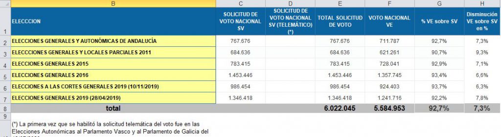 - Los votos emitidos representan, finalmente, el 94,2% de las solicitudes admitidas, el ratio más alto alcanzado en elecciones generales desde 2008, el primer año con registros estadísticos homologados