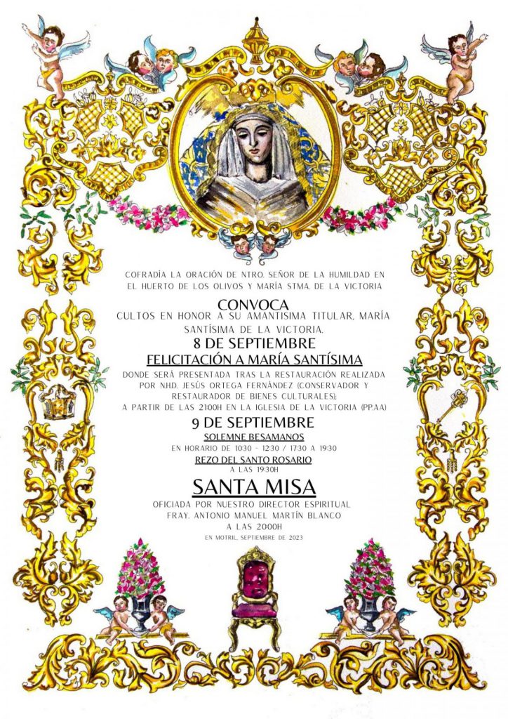 Este próximo viernes día 8 de septiembre y coincidiendo con el día de su festividad litúrgica, se presentará la imagen de María Santísima de la Victoria tras la restauración a la que ha sido sometida en estos dos últimos meses.