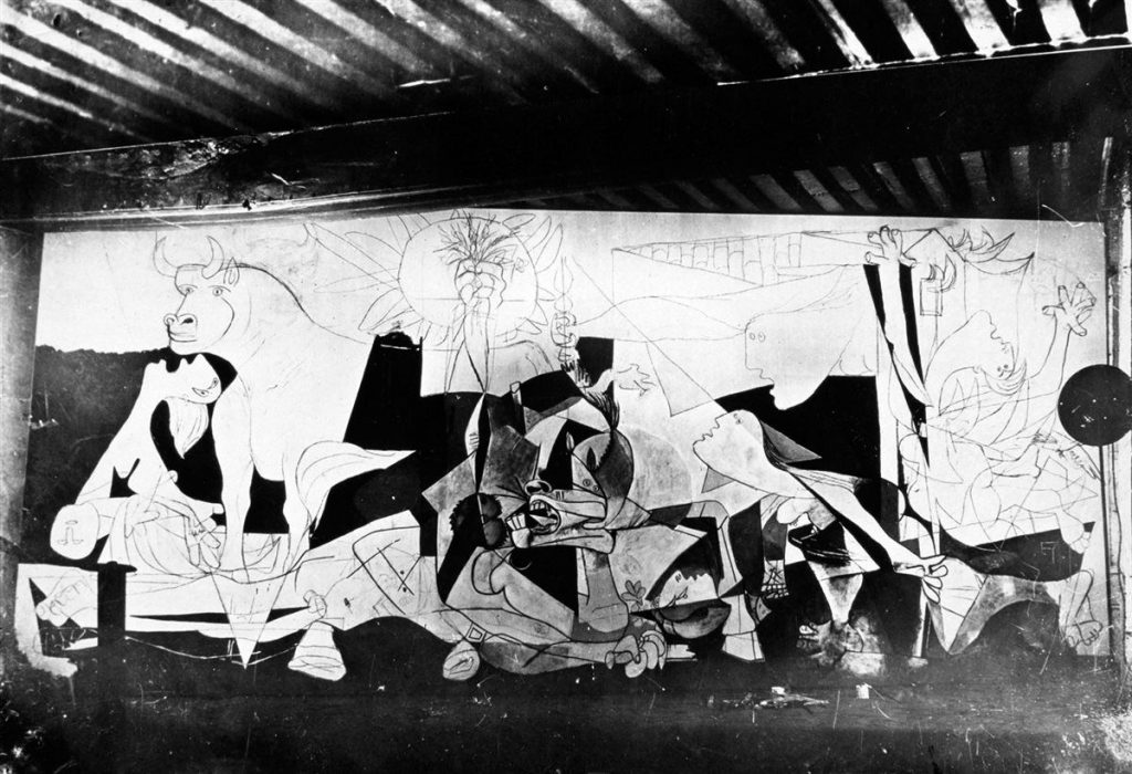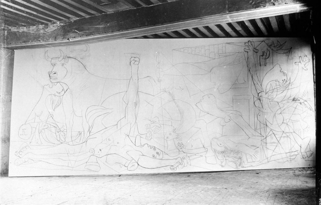 Los primeros estudios para la obra datan de abril de 1.937 y son dibujos sobre papel azul. Pocos días después, el lunes, 26 de abril, estalla el drama del bombardeo de Guernica, capital cultural e histórica vasca, por los aviones de la legión Cóndor: la primera gran masacre de civiles de la época contemporánea. Picasso se entera, dos días después, el 28 de abril, al leer las noticias y ver las fotografías publicadas en el periódico “L´Humanité”. El primer esbozo del cuadro lo inicia el 1 de mayo y lo finaliza el 4 de junio, cinco semanas después, un tiempo breve para una obra tan monumental y compleja desde el punto de vista formal y del contenido.