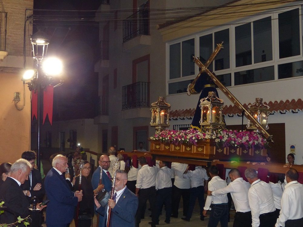 Según el protocolo dispuesto, marcha a continuación la representación eclesiástica que ostenta el párroco, D. Fernando Rodríguez Fernández, junto al titular de la parroquia de Albondón, Murtas y Turón, D. Antonio Jesús Guzmán Díaz, y el hermano mayor de la hermandad, D. Eloy Heredia Cortés, que dan paso ya al cuerpo de acólitos e incensarios. De seguida se disponen las andas de Nuestro Padre Jesús Nazareno que dirige su capataz, Juan Antonio Montes Sánchez y que queda a cargo de una cuadrilla de tipo mixta compuesta por dieciocho hermanos portadores. Marcha esta en modalidad de varal malagueño, lo que confiere al trono del Nazareno un señorial porte en su caminar. Para esta solemne ocasión, los hermanos han sustituido su tradicional túnica de color negro por una vestimenta en la que destaca la camisa de color blanco con el logotipo del aniversario en el pecho y pantalón de color negro. Sobre las andas se alza majestuosamente la imagen de Nuestro Padre Jesús Nazareno, que ha sido felizmente restaurada por el artista motrileño Jesús Ortega. Muestra el titular la espectacular túnica que ha sido confeccionada por las hermanas del Convento de las Comendadoras de Santiago, donde se deja ver su laborioso trabajo de bordado en oro del pecho, bocamanga y parte interior de la túnica. Igualmente, el Nazareno ostenta en su pecho la medalla del pueblo que el pasado día 2 le fue impuesta por su primera edil. Sobre sus hombros, la imagen titular estrena la cruz, que ha sido realizada en madera “paulownia” en el taller “Carpintería Ferrándiz”, de Albuñol y policromada por el imaginero granadino Alberto Olmedo Muñoz. Tiene unas dimensiones de 1,24 ms de “patibulum”, y 2,45 ms de “stipes” y es una auténtica obra de arte. Contiene imitación a taracea, concha de carey y hueso y, en los óvalos, se pueden contemplar los atributos de la pasión por ambas caras. En unos medallones centrales se representa el cordero del apocalipsis sobre el libro de los siete sellos y el corazón de María con los siete puñales. A media altura del “stipes” tiene representada el águila de San Juan Evangelista y el pelícano por la otra cara y, como guiño al LXXV aniversario, en uno de los óvalos del extremo inferior lleva su logotipo. Además, las aristas de la cruz han sido embellecidas con media caña de pan de plata y los extremos están rematados con cantoneras con una granada que son obra de los talleres de arte Moreno.