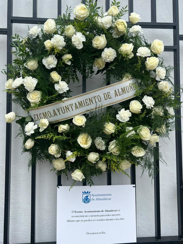“Con esta corona queremos rendir homenaje y mostrar nuestra solidaridad a todos los difunto que acoge el Cementerio y que no pueden ser visitados estos días”, dijo la edil responsable del área, María del Carmen Reinoso.