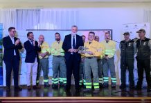 Los bomberos del Infoca y el ex delegado de Turismo, Gustavo Rodríguez, reciben el...