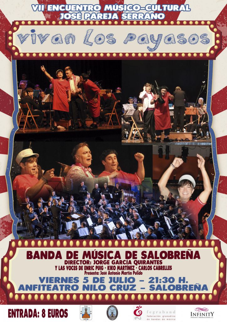 La Banda de Música de Salobreña, junto a Infinity Eventos y Producciones S.L., presentan el espectáculo: «VIVAN LOS PAYASOS» que tendrá lugar el viernes 5 de julio a las 21.30 horas en el Anfiteatro «Nilo Cruz»