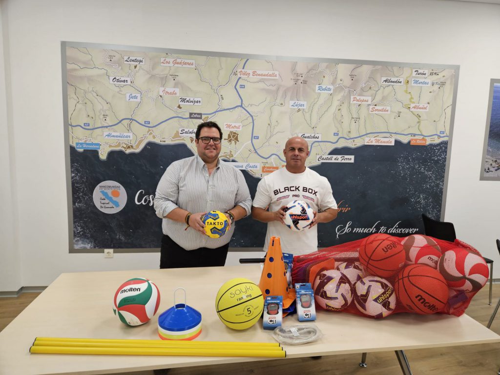 El lote de material deportivo adquirido por la Mancomunidad de la Costa Tropical y puesto a disposición de los ayuntamiento está formado por balones de balonmano, de baloncesto, de voley y de fútbol, con su bolso portabalones, cronómetro, aros, picas, ladrillos reforzados enganches de picas, conos huellas de pie y manos para marcas, pelotas polivalentes y pañuelos multiejercicios.