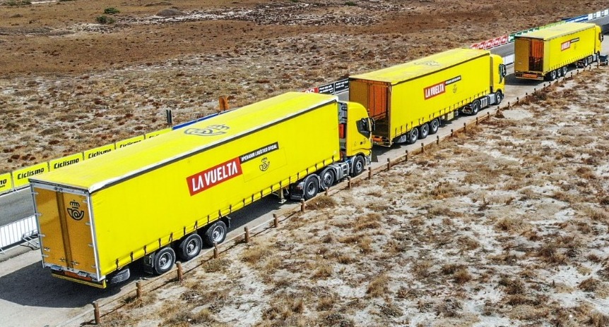 En este auténtico desafío logístico, Correos está desplazando más de 400 toneladas del material necesario para que la prueba pueda disputarse sin incidencias logísticas en sus 42 sedes (21 salidas y 21 metas), incluidas las tres primeras etapas que se celebraron en Portugal. La empresaha puestoa disposición de La Vuelta 27 cabezas tractoras, dos camiones con remolque, un camión rígido y 15 plataformas para recorrer 3.265 kilómetros cargados con el material clave necesario para la celebración de la carrera.
