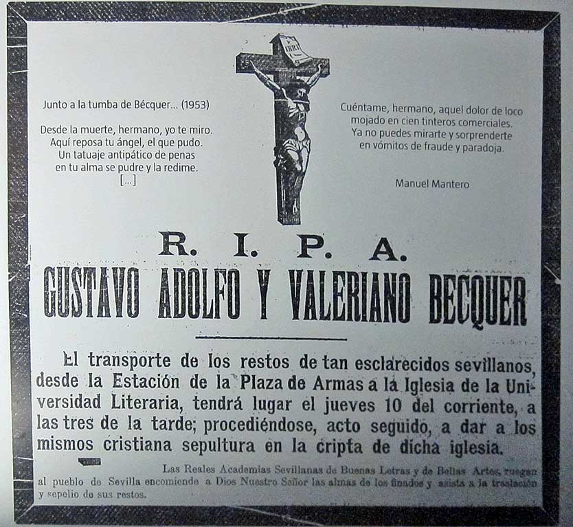Madrid, nº 7 de la calle Claudio Coello. Gustavo Adolfo Bécquer, hombre desdichado y poeta muy afortunado, fallece a las 10 de la mañana del jueves, 22 de diciembre de 1870, de un “grave infarto de hígado, complicado con una fiebre intermitente maligna o perniciosa”, cuando sólo cuenta con 34 años de edad, 3 meses después de fallecer su hermano Valeriano el día 23 septiembre de 1870. El 23 de diciembre, a las 13 horas, es enterrado en la Sacramental de San Lorenzo y San José de Madrid, en el Patio del Cristo, nicho 470. Cuarenta y tres años más tarde, en abril de 1913, y gracias a las gestiones del arqueólogo, historiador del arte y escritor sevillano José Gestoso Pérez (1852 – 1917), los restos de Gustavo Adolfo y de su hermano Valeriano son exhumados y enterrados en Sevilla en la Iglesia de la Anunciación, siendo posteriormente trasladados al Panteón de Sevillanos Ilustres.