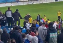 Jugadores melillenses saltan a la grada para enfrentarse con la afición local cuando el conjunto blanquiazul ganaba por 2-0