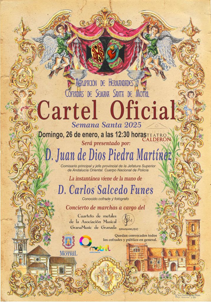 La Agrupación de HHCC de Motril ha anunciado que el cartel oficial de Semana Santa 2025, verá la luz este domingo 26 de enero, a las 12:30 horas, en el Teatro Calderón de la Barca, que vendrá ilustrado con una instantánea de Carlos Salcedo Funes, conocido cofrade y fotógrafo, cayendo la responsabilidad de la presentación este año en la persona de Juan de Dios Piedra Martínez, Comisario Principal y Jefe Provincial de la Jefatura Superior de Andalucía Oriental del Cuerpo Nacional de Policía.