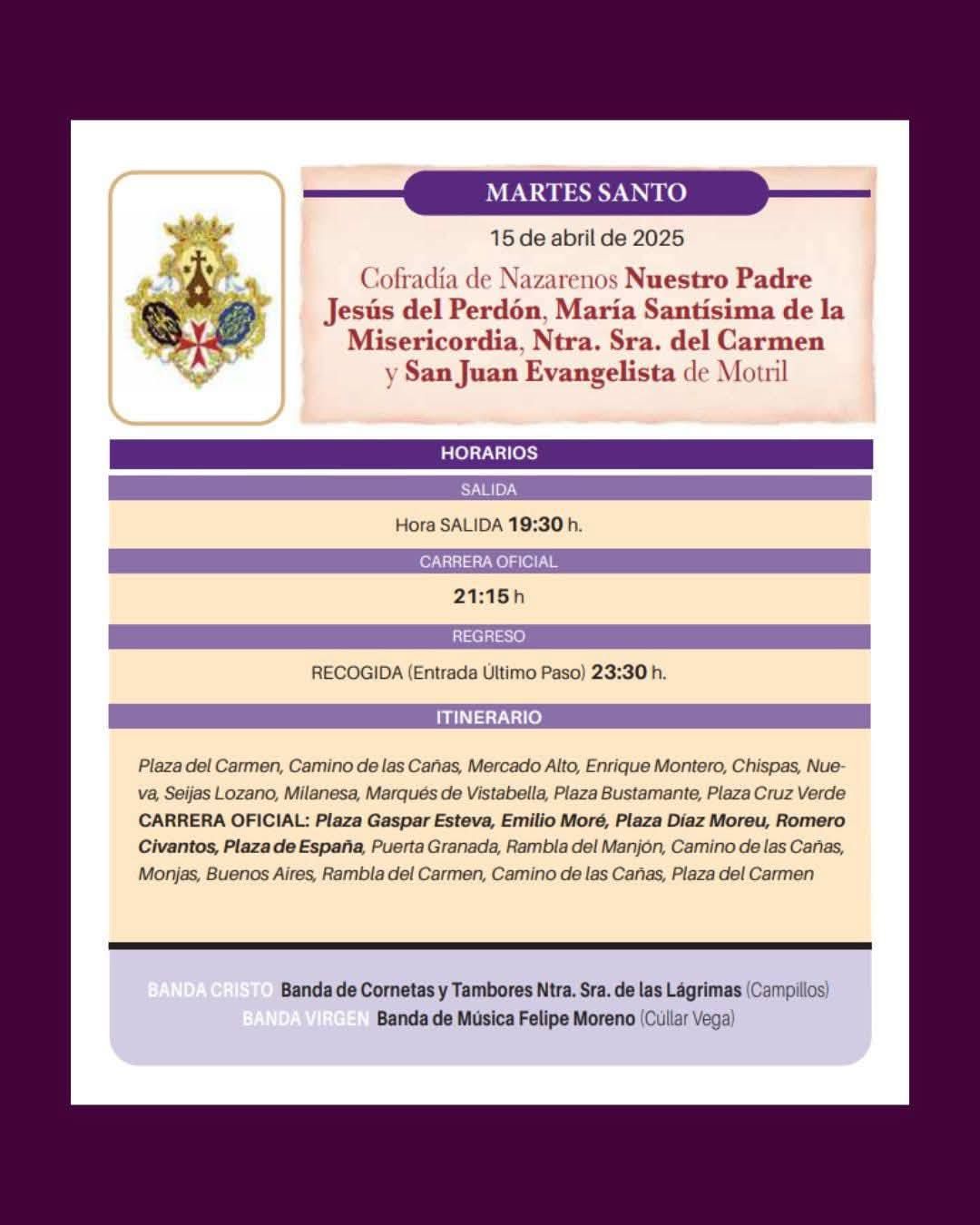 EL FARO les ofrece en directo la Semana Santa de Motril. Hoy, Martes Santo, comenzamos la retransmisión a las 20:30 horas, con la estación penitencial en directo por Carrera Oficial de la Cofradía de Nazarenos Nuestro Padre Jesús del Perdón, María Santísima de la Misericordia, Nuestra Señora del Carmen y San Juan Evangelista, y desde la Iglesia del Carmen, la salida procesional en diferido.