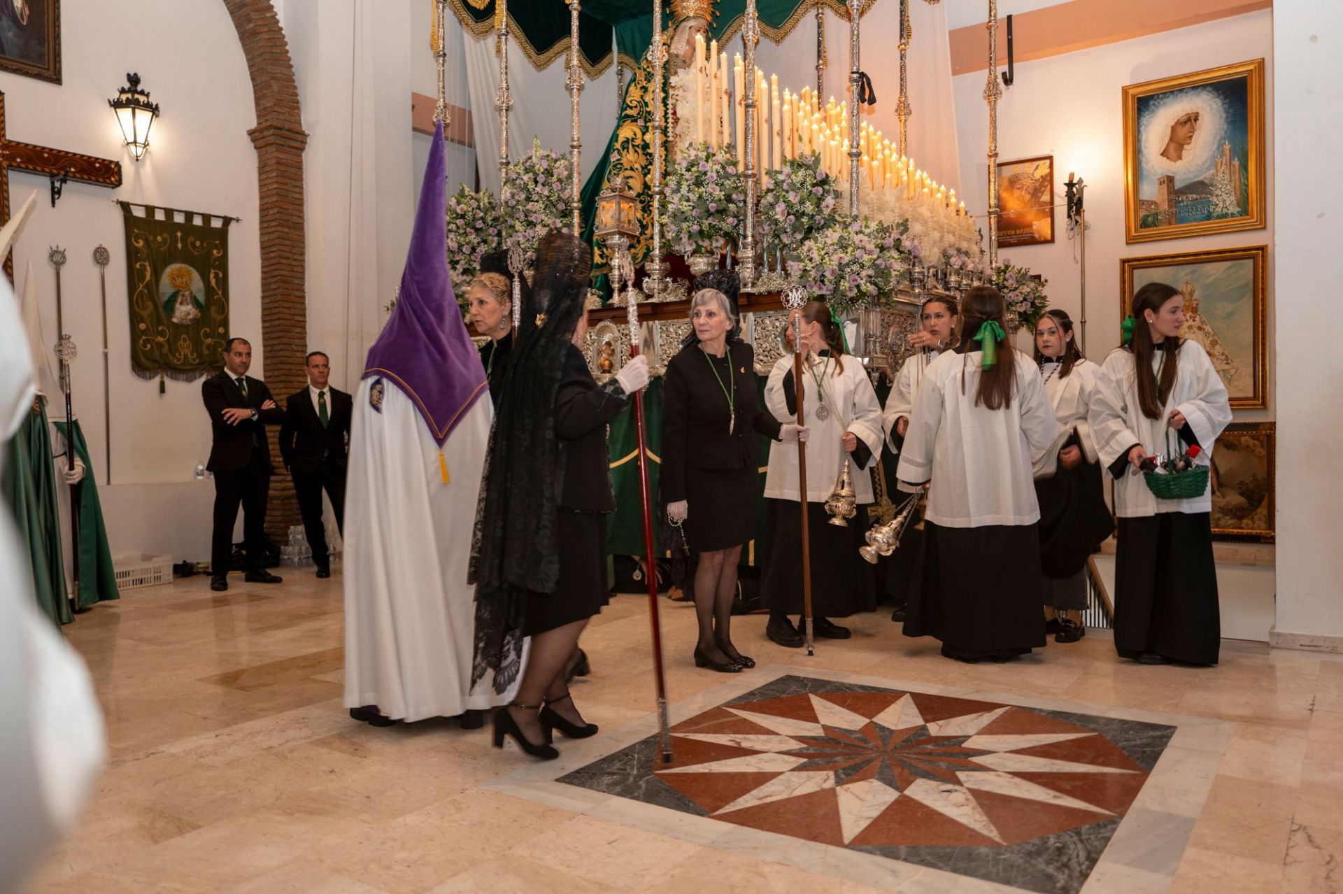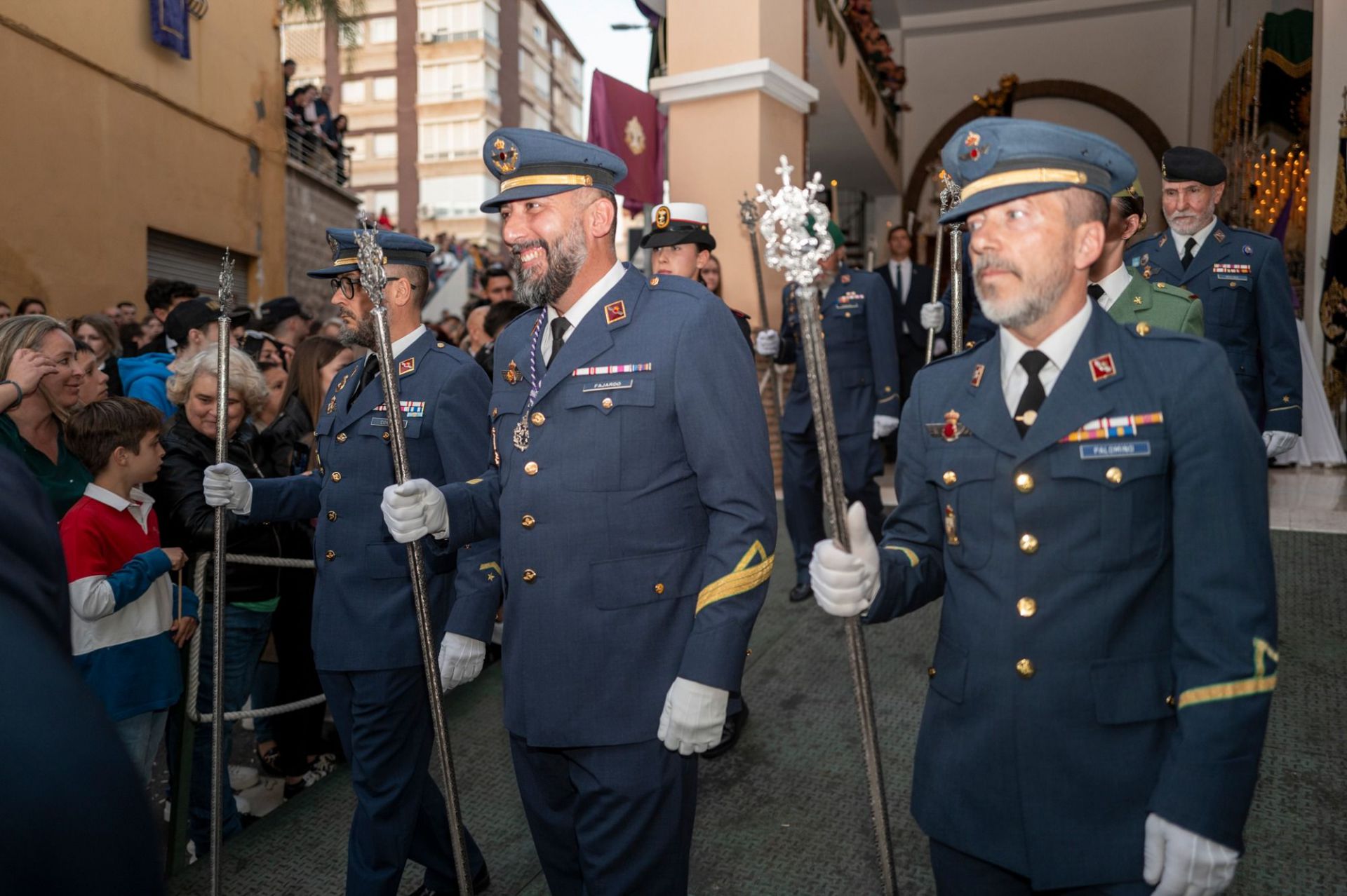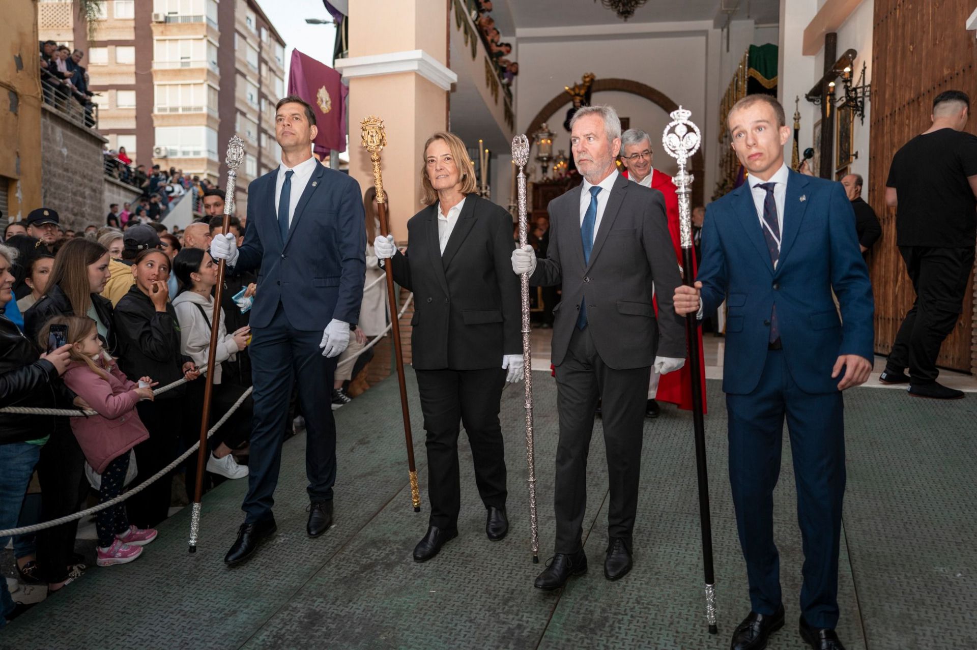 Tras él el libro de reglas, que va escoltado por dos varas presidenciales, sucede ahora el estandarte cristífero flanqueado por dos faroles. A continuación, va dispuesta la amplia representación de las “pavera” infantil, cuyos miembros van tocados con habito penitencial de color morado, capa blanca y cíngulo dorado. Sigue ahora la representación oficial que ostentan las tres personas que la cofradía ha galardonado con los premios Nazareno “Señor de Motril” de este año de 2025. Se trata de D. José A. Hernández Marín y D. Juan José Alcausa Lorenzo, ambos en calidad de antiguos hermanos y D. José Gaspar Palomino Peregrina, cabo Mayor del Ejército del Aire. Junto a ellos, el hermano en activo de mayor antigüedad, Carlos Bustos Rodríguez. Sigue, igualmente, una representación del Escuadrón de Vigilancia Aérea de Motril (EVA9), en su calidad de Hermano Mayor Honorario, además del resto de los tres ejércitos, entre los que hay que mencionar a la dama legionaria Dª Marina Rodríguez Martínez y la soldado de infantería Dª Pastora Barros Jiménez. Esta representación da paso a la propia del ayuntamiento de la ciudad que encabeza la alcaldesa, Dª Luisa Mª García Chamorro, y el concejal de Fiestas, D. Gerardo Romano Rodríguez, además del presidente de la Autoridad Portuaria de Motril, D. José García Fuentes y D. Raúl Lizana Domínguez, que lo hace en comisión de la hermandad de Nuestra Señora de la Cabeza Coronada,
