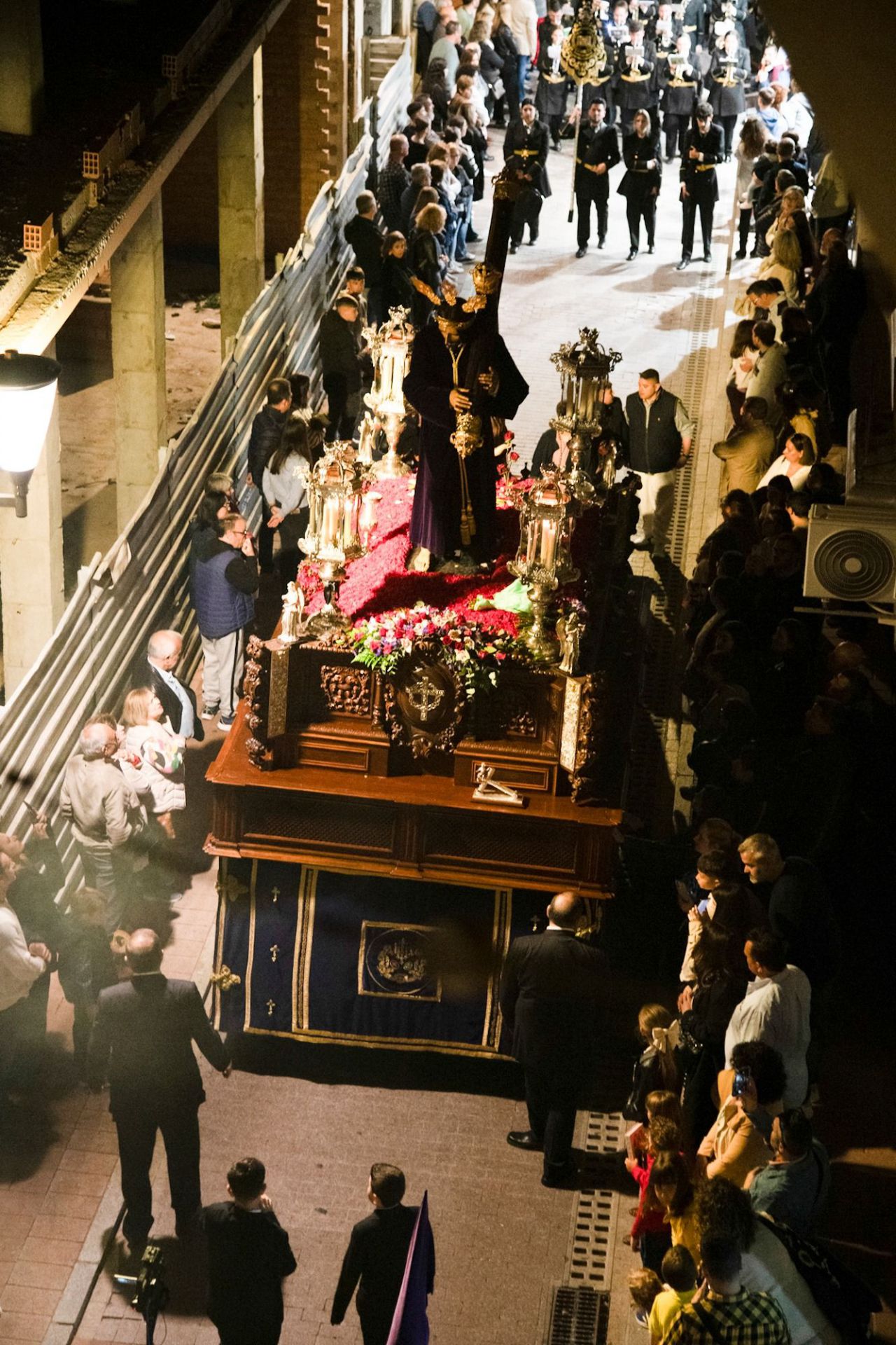 Sigue ahora en el orden del cortejo el cuerpo de acólitos ceroferarios que componen el juego de los ciriales con su pertiguero al centro, junto al propiamente turiferario que va purificando el ambiente ante la inmediatez del paso de Jesús Nazareno. Sobre su impresionante canastilla se yergue majestuosa la imagen titular, obra del escultor granadino Antonio Martínez Ollalla, que fue tallada en el año de 1938 y que paso a recibir culto en la iglesia de las RR. MM. Nazarenas por causa del devastador estado que presenta la iglesia de la Encarnación tras la explosión del polvorín ubicado en la cripta de la Virgen de los Dolores. El escultor puso aquí su gubia al servicio del sentido catequético que desprende una imagen sagrada y que busca trasladar a los fieles el rostro sereno y atribulado del Hijo de Dios que va a entregar su vida para redimir a los hombres. Presenta el Nazareno su tradicional túnica lisa en terciopelo de color morado, cíngulo dorado, corona de espinas y las tres potencias que subliman su triunfo sobre la muerte, el dolor y el mal. El paso va orlado con un centro de rosas de color rojo sobre el que se extiende un friso de “statis” de color morado, orquídeas y eucalipto, figurando a los pies del Nazareno una impresionante alfombra de claveles de color rojo para significar la sangre que va a derramar el Redentor con su muerte en la cruz. Todo este exorno floral ha sido realizado por “Flores Correa”. El paso va dirigido por su capataz, Francisco José Pérez Lozano, estando asistido en labores auxiliares por Antonio Jesús Sánchez Gutiérrez, Víctor Sánchez Gutiérrez y Joaquín Díaz González. Finalmente, ha cerrado la sección nazarena la Agrupación Musical San Elías y San Juan Evangelista de Alcaudete (Jaén), que actúa por primera vez en la semana santa de Motril. Dirige la misma el maestro Álvaro Contreras Roldán, que ha desplazado para la ocasión a un total de 68 componentes que han brillado con luz propia en los agradables sones que marca el andar de la cuadrilla de costaleros del paso. Ha sido un amplio repertorio de marchas de corte clásico el que se ha seleccionado para este día siguiendo ese peculiar toque de espectacularidad que le confiere la Asociación Musical “Los Gitanos de Sevilla”, esquema que siguen instrumentalmente sus directores Pedro Manuel Pacheco Palomo y Óscar Ruiz. La agrupación ha efectuado la salida del paso de la casa hermandad a los sones de la “Marcha Real” para, inmediatamente, continuar con “Que grande ser de ti”, ritmo y melodía con sólo de corneta y trompetas que, acompasadas por el resto de instrumentos de viento y percusión han hecho lucir el paso de la cuadrilla costalera, lo que ha permitido escuchar en la calle los primeros aplausos del público presente. Imponente ha sido su paso por tribuna oficial, donde se han dejado oír las marchas “Señor de una devoción”, de Francisco José Ortiz Morón, “La Saeta”, “Santo es el Señor” y “Nuestro Señor”, que, con sus toques cadenciosos y sonoros ha hecho lucir nuevamente a la cuadrilla costalera. Igualmente de espectacular ha sido su paso por la tribuna de la plaza de España a los sones de “Esperanza de María”, original de Alejandro Blanco Hernández, que con un ritmo de menor a mayor ha ido subiendo enteros en la intensidad de la música para conferir al paso un señorial porte que ha vuelto a brindar los aplausos a la agrupación. Igualmente ha sonado “Virgen de las Angustias”, de Manuel Rodríguez Ruiz, cuya composición de corte triunfal y el toque de xilófono ha sido de gran gusto para el público presente.